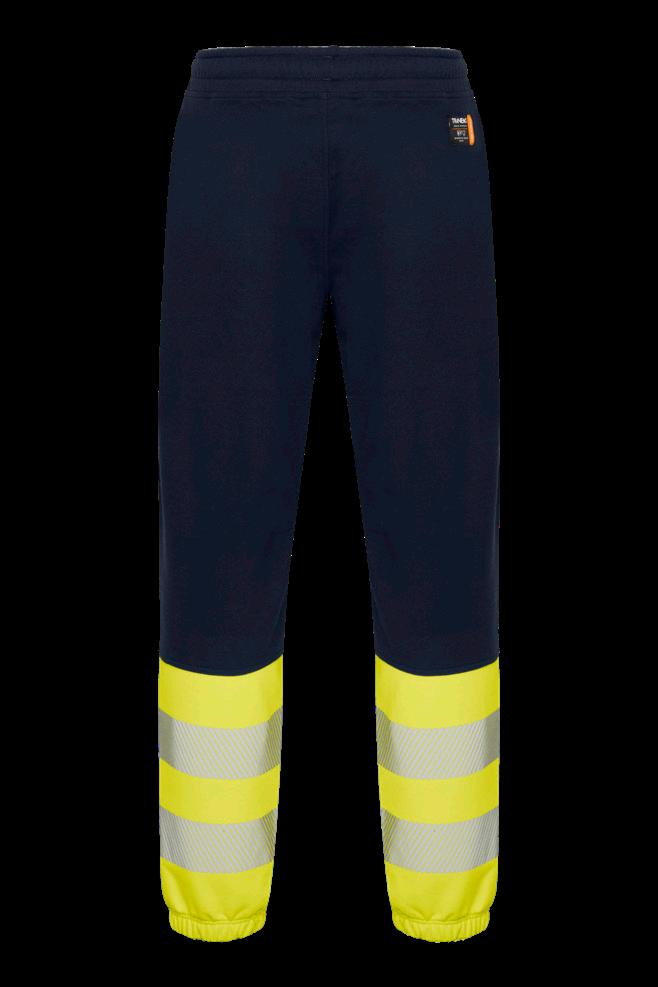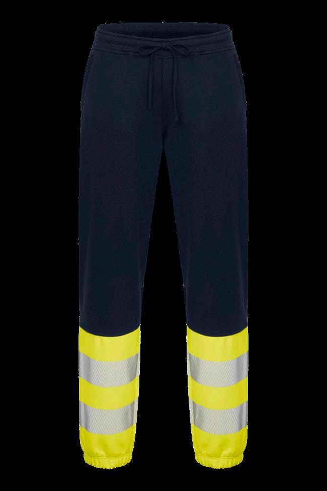 Metallfreie, inhärent flammhemmende HI-VIS Jogginghose für Damen. PFAS-freier Sweatshirt-Stoff, bei dem 50% des Baumwollanteils recycelt wird. Elastischer Bund mit Kordel. Seitliche Eingriffstaschen mit Reißverschluss. Strickbündchen. Segmentierte Thermoreflexstreifen für erhöhten Tragekomfort.