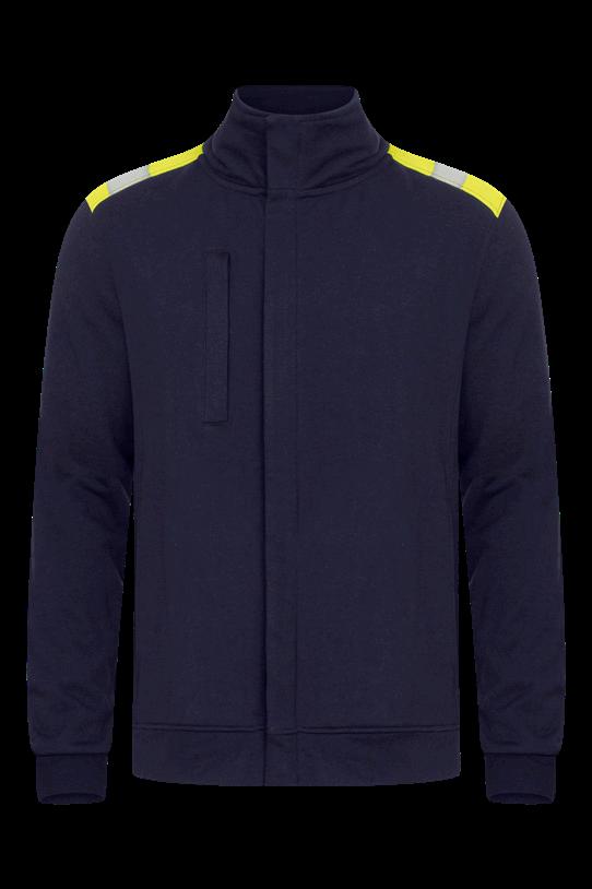 Chaqueta de punto no metálica inherentemente ignífuga en una tela suave de sudadera. Tejido sin PFAS, donde el 50% del algodón es reciclado. Cremallera oculta. Bolsillo pectoral con cremallera. Bolsillos delanteros. Puños de punto. Bandas reflectoras termoselladas.