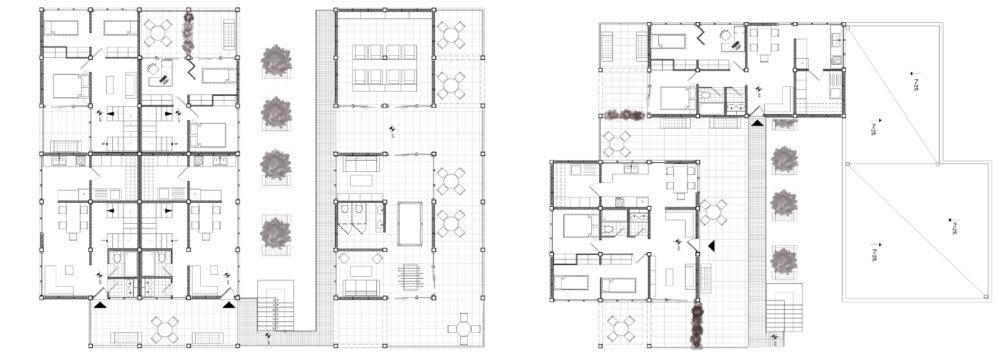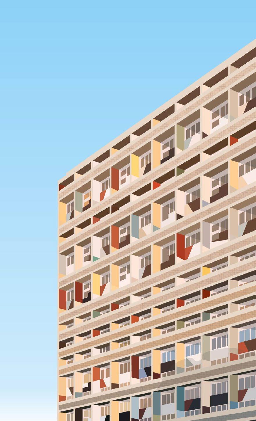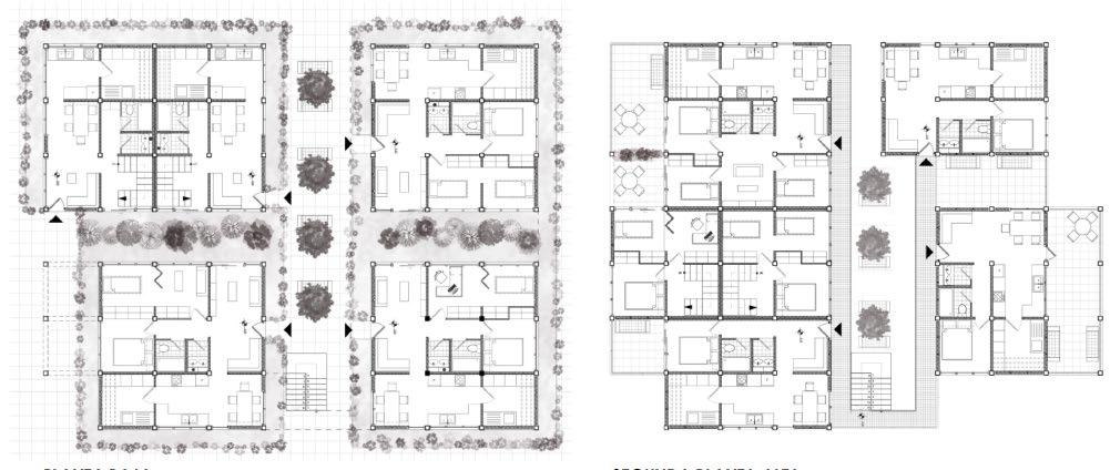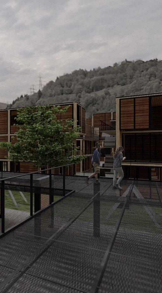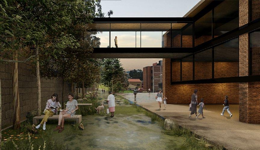 The housing between rivers intervention aims to integrate a collective housing project with its immediate surroundings and the city, generating a high-density urban fabric that incorporates public, semi-public, and private spaces for the community. The project utilizes a module (2.70 x 2.70m) made up of prefabricated, energy-efficient panels, which are grouped into 3 supermodules of varying heights (5, 4, and 3 stories), resulting in a density of 120 dwellings/ ha. Through functional, formal, architectural, urban, constructive, sustainable, and social criteria, this project seeks to interconnect spaces and harmoniously blend with its surroundings.