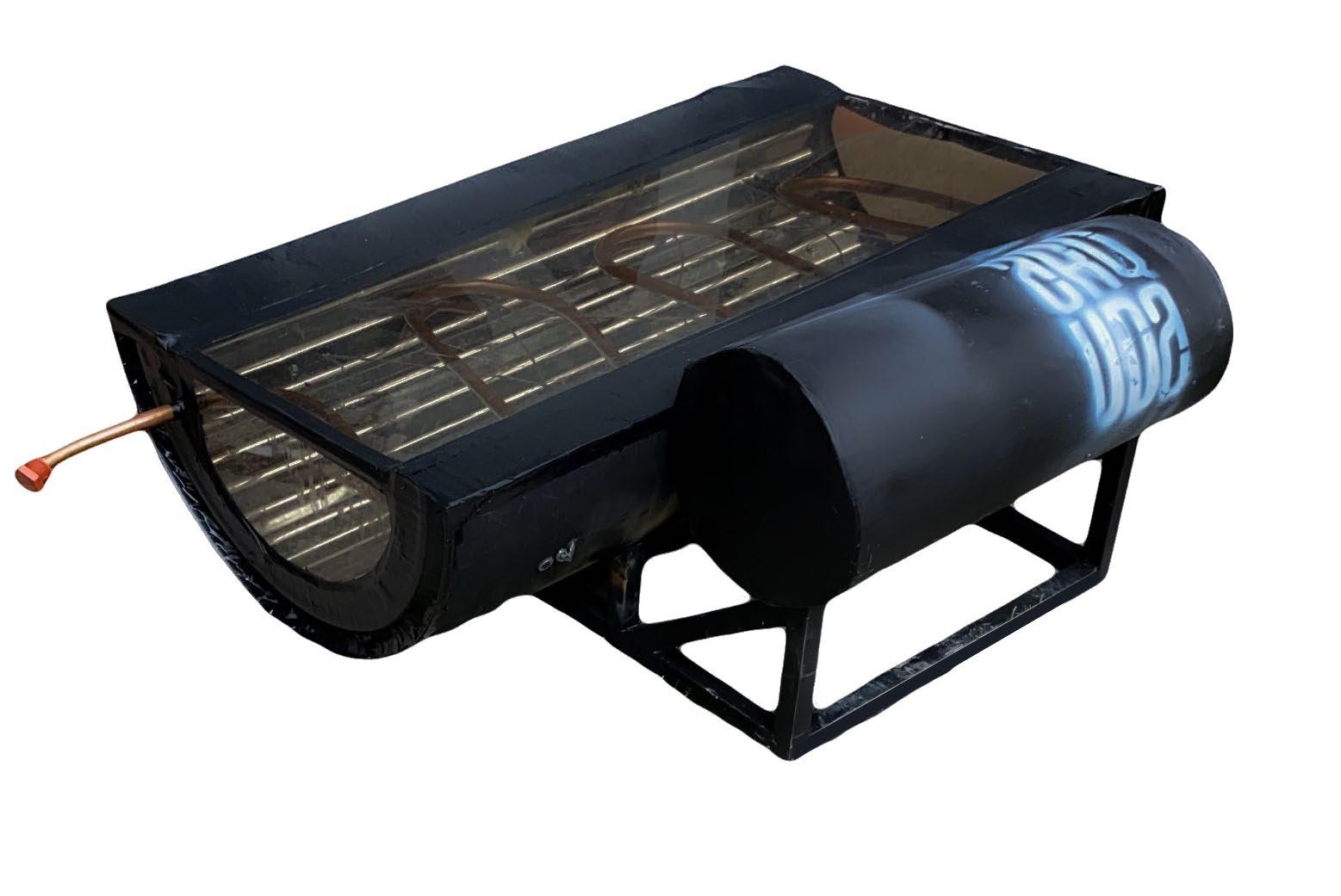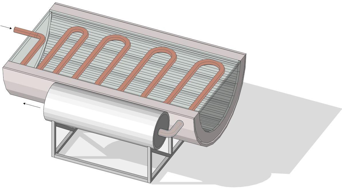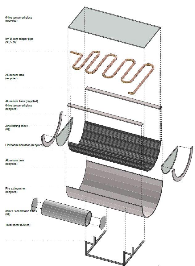 The solar panel harnesses sunlight to generate a greenhouse effect, which increases the water temperature as it passes through the panel. Its simple and lightweight design makes it adaptable to any housing structure, and it is situated to receive sunlight from dawn until dusk. Recycled materials are used to make the panel, with a metallic, black, and semi-circular base that enhances heat accumulation. The panel also features a thermal insulation coating and a reflective zinc layer, sealed with glass to keep heat isolated from the outside. The semi-circle shape of the panel allows for more air and heat generation inside, making it more efficient than a straighter shape. Overall, this panel is a practical and environmentally friendly option that improves the planet.