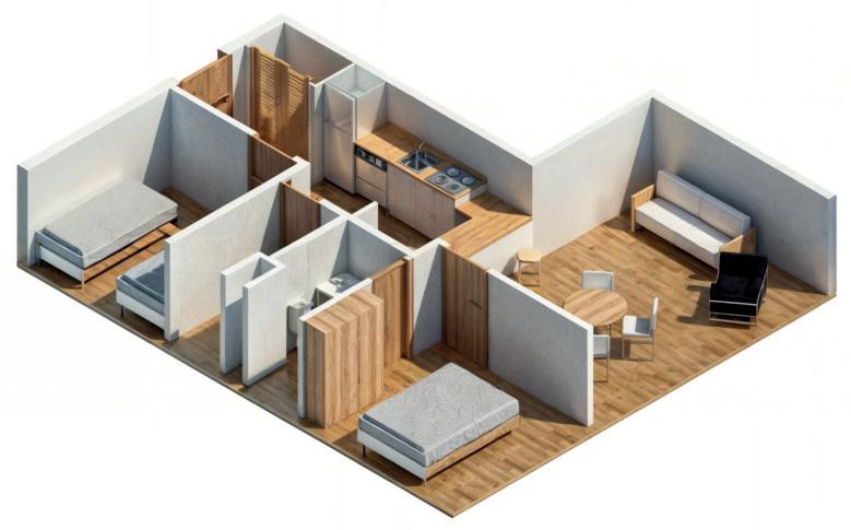 El diseÒo de las unidades de vivienda se desarrolla en base a una malla modular de 20 x 20 cm, que establece un sistema ordenado y flexible. Este enfoque permite configurar los mÛdulos siguiendo criterios de disposiciÛn funcional y medidas recomendadas para optimizar el uso de los espacios. Cada mÛdulo responde a las necesidades específicas de habitabilidad, asegurando la armonÌa entre eficiencia espacial y confort.