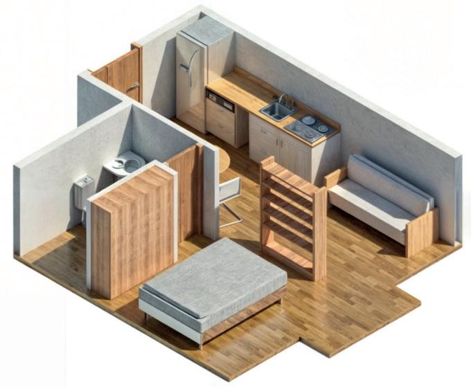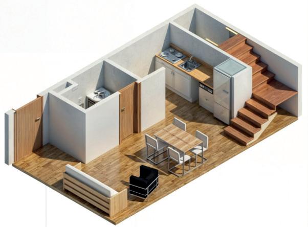 Perspectiva sala de estar y comedor - Tipologia 50 m2