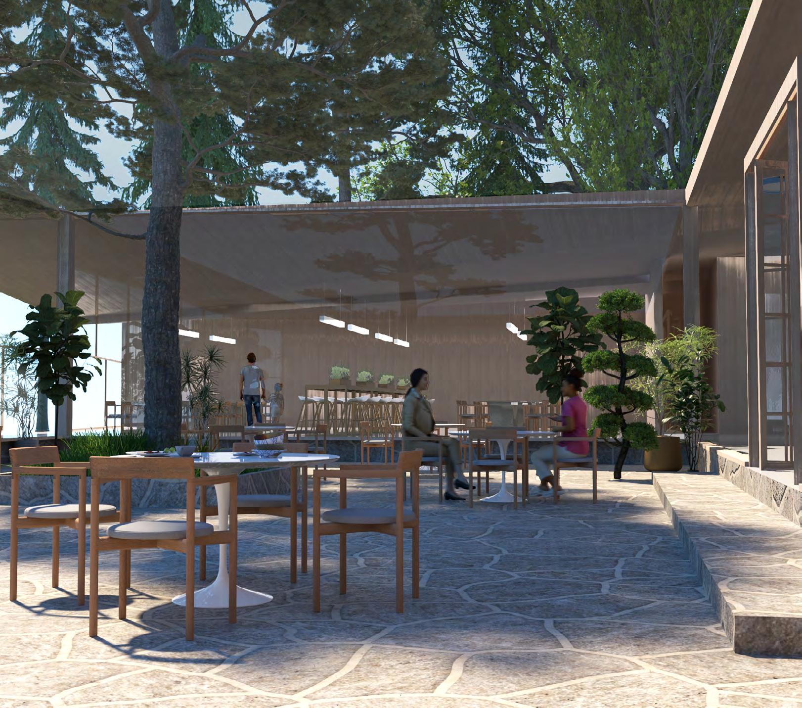 The courtyard serves as an inviting central area for communal dining and relaxation, fostering openness and connection with nature.