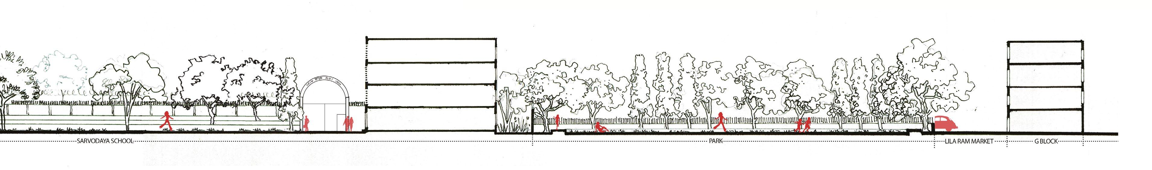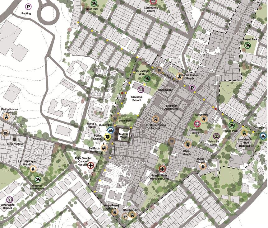 3. MULTIPLE ENTRANCES to re-establish the lost identity. In order to bring back the identity overshadowed, the first step could be to make its’ present. Area where there is a way to Masjid Moth village could be dedicated to reflect the heritage character to make the presence of it evident. Negotiating with the community parks to insert the heritage character could work for the same.
