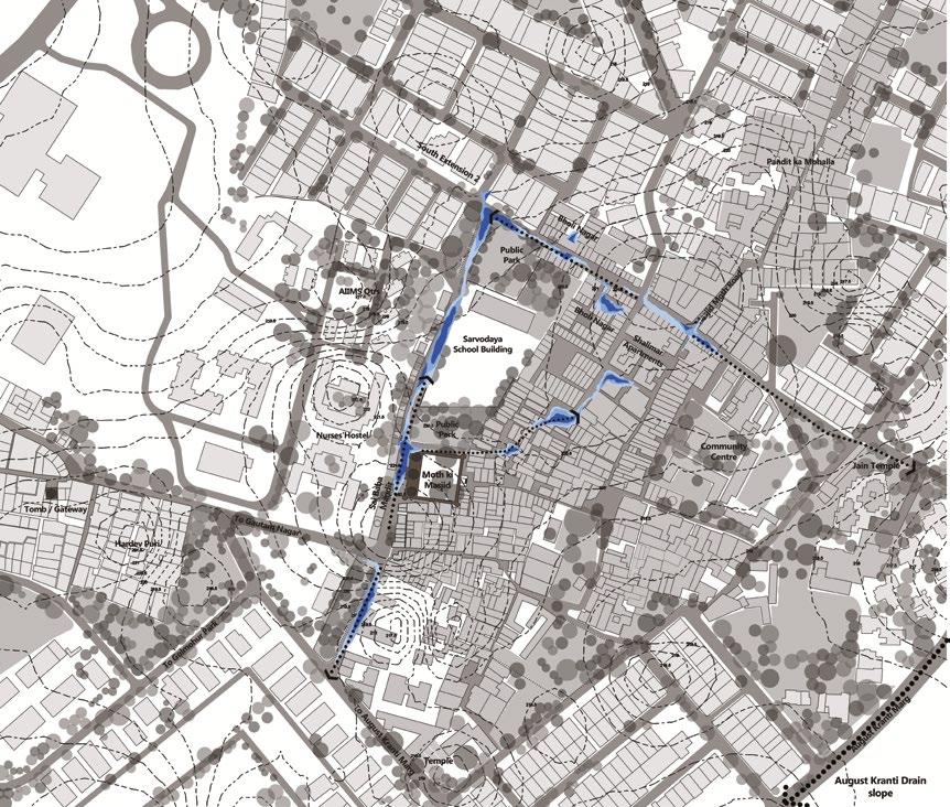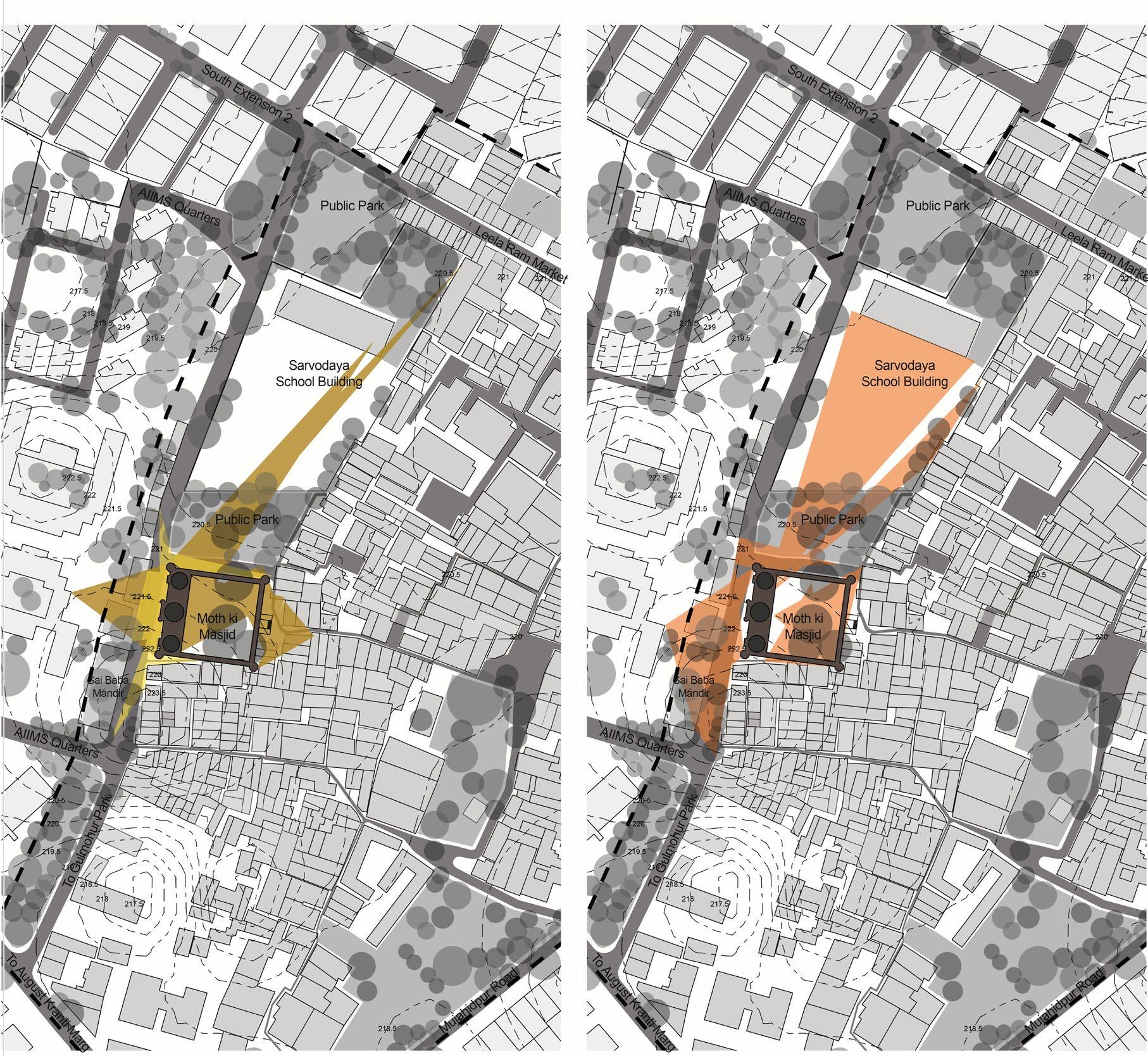 8. PLANTING strategies are to complement the setting, while the forcourt needs to have dense planting on the other side of nurses’ hostel wall, the one towards the school need to have less canopy trees to mantain the visual connect. The road approaching to the Masjid from Leela Ram Market is to have low heigth shrubbery to get the glimpse of Masjid on the way.
