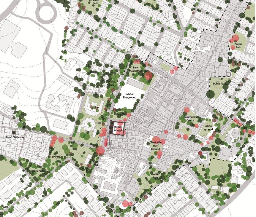 Assessment of Open Spaces, Analysing the pressure on greens to identify open spaces that could be used as heritage greens to establish new network and a way to bring back he lost identity and dignity of the monument