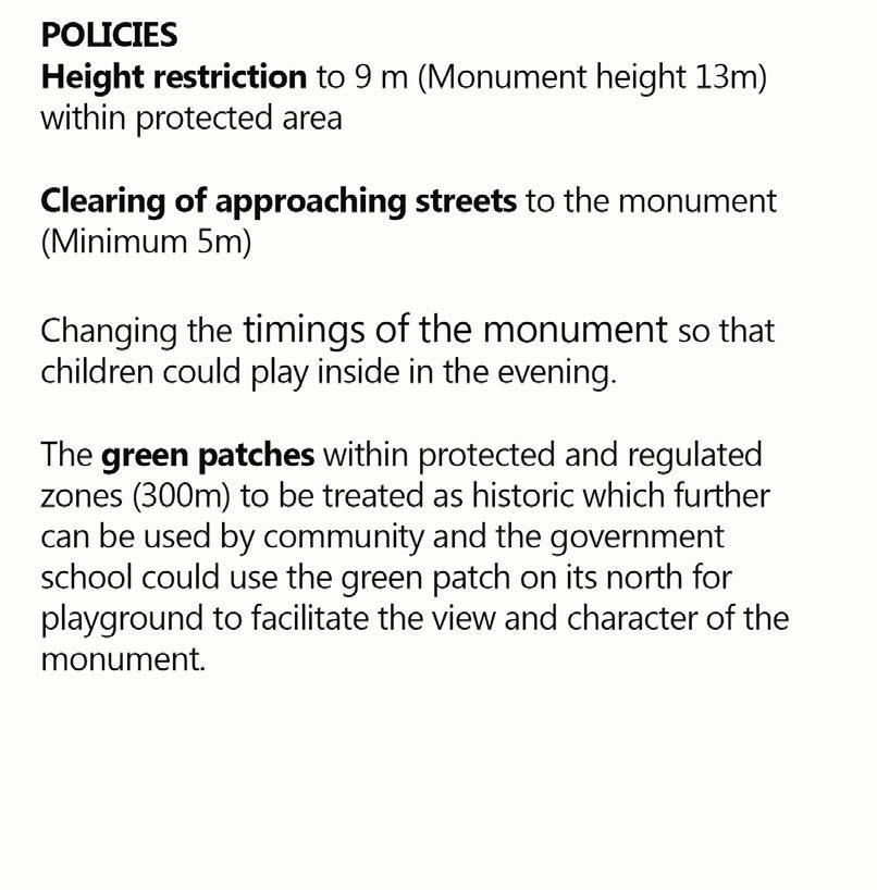 Changing the timings of the monument so that children could play inside in the evening. The green patches within protected and regulated zones (300m) to be treated as historic which further can be used by community and the government school could use the green patch on its north for playground to facilitate the view and character of the monument.