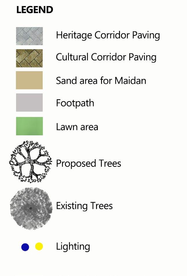 7. EXPERIENCES as expressions are mentioned in the conceptual masterplan to build the historiction throughout the two corridors and the vista of he approaching roads. Although the sense of mystery needs to be retained, some basic necessary moves like conservation of the Unknown Tomb / Gateway is essential and a small plaza as a pause could enhance the experience. The Rajiv Gandhi Hospital wall which falls in between he heritage corridor can reflec the historic presence and also be the signage to educate people visiting it. The lighting also needs to be such that the sense of mystery is reflected and also the lighting is ample for the adjoining buildings to walk freely in the night