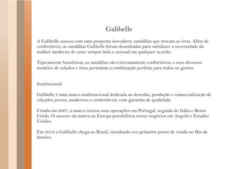 Galibelle A Galibelle nasceu com uma proposta inovadora: sandálias que trocam as tiras. Além de confortáveis, as sandálias Galibelle foram desenhadas para satisfazer a necessidade da mulher moderna de estar sempre bela e sensual em qualquer ocasião. Tipicamente brasileiras, as sandálias são extremamente confortáveis, e seus diversos modelos de solados e tiras permitem a combinação perfeita para todos os gostos. Institucional Galibelle é uma marca multinacional dedicada ao desenho, produção e comercialização de calçados jovens, modernos e confortáveis, com garantia de qualidade. Criada em 2007, a marca iniciou suas operações em Portugal, seguido de Itália e Reino Unido. O sucesso da marca na Europa possibilitou novos negócios em Angola e Estados Unidos. Em 2012 a Galibelle chega ao Brasil, instalando seu primeiro ponto de venda no Rio de Janeiro.