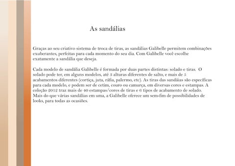 As sandálias Graças ao seu criativo sistema de troca de tiras, as sandálias Galibelle permitem combinações exuberantes, perfeitas para cada momento do seu dia. Com Galibelle você escolhe exatamente a sandália que deseja. Cada modelo de sandália Galibelle é formada por duas partes distintas: solado e tiras. O solado pode ter, em alguns modelos, até 3 alturas diferentes de salto, e mais de 5 acabamentos diferentes (cortiça, juta, ráfia, palermo, etc). As tiras das sandáias são específicas para cada modelo, e podem ser de cetim, couro ou camurça, em diversas cores e estampas. A coleção 2012 traz mais de 40 estampas/cores de tiras e 6 tipos de acabamento de solado. Mais do que várias sandálias em uma, a Galibelle oferece um sem-fim de possibilidades de looks, para todas as ocasiões.