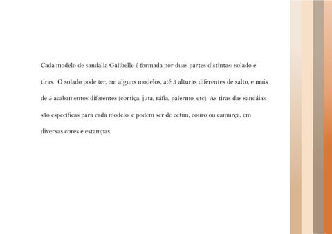 Cada modelo de sandália Galibelle é formada por duas partes distintas: solado e tiras. O solado pode ter, em alguns modelos, até 3 alturas diferentes de salto, e mais de 5 acabamentos diferentes (cortiça, juta, ráfia, palermo, etc). As tiras das sandáias são específicas para cada modelo, e podem ser de cetim, couro ou camurça, em diversas cores e estampas.