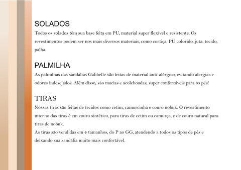 TIRAS Nossas tiras são feitas de tecidos como cetim, camurcinha e couro nobuk. O revestimento interno das tiras é em couro sintético, para tiras de cetim ou camurça, e de couro natural para tiras de nobuk. As tiras são vendidas em 4 tamanhos, do P ao GG, atendendo a todos os tipos de pés e deixando sua sandália muito mais confortável.