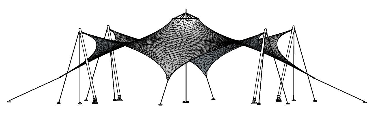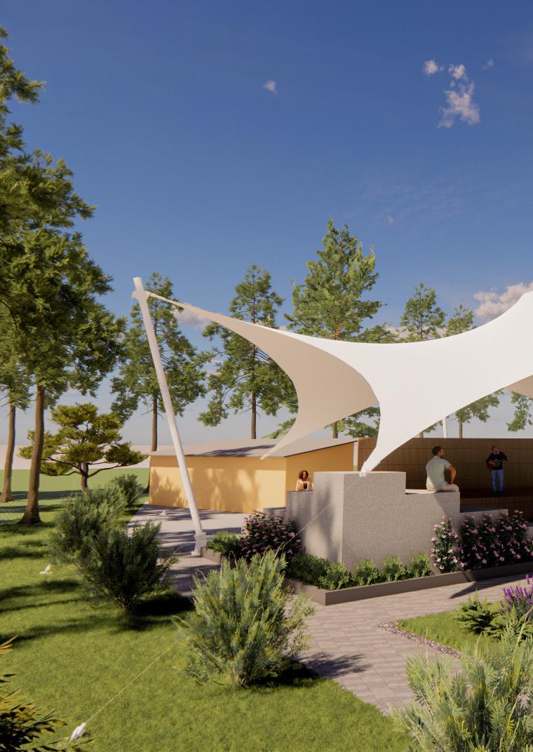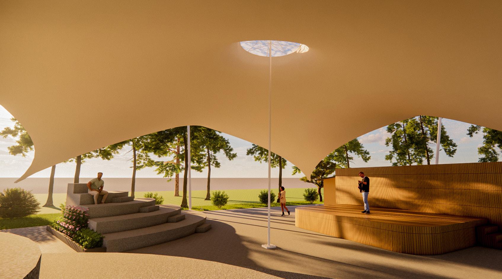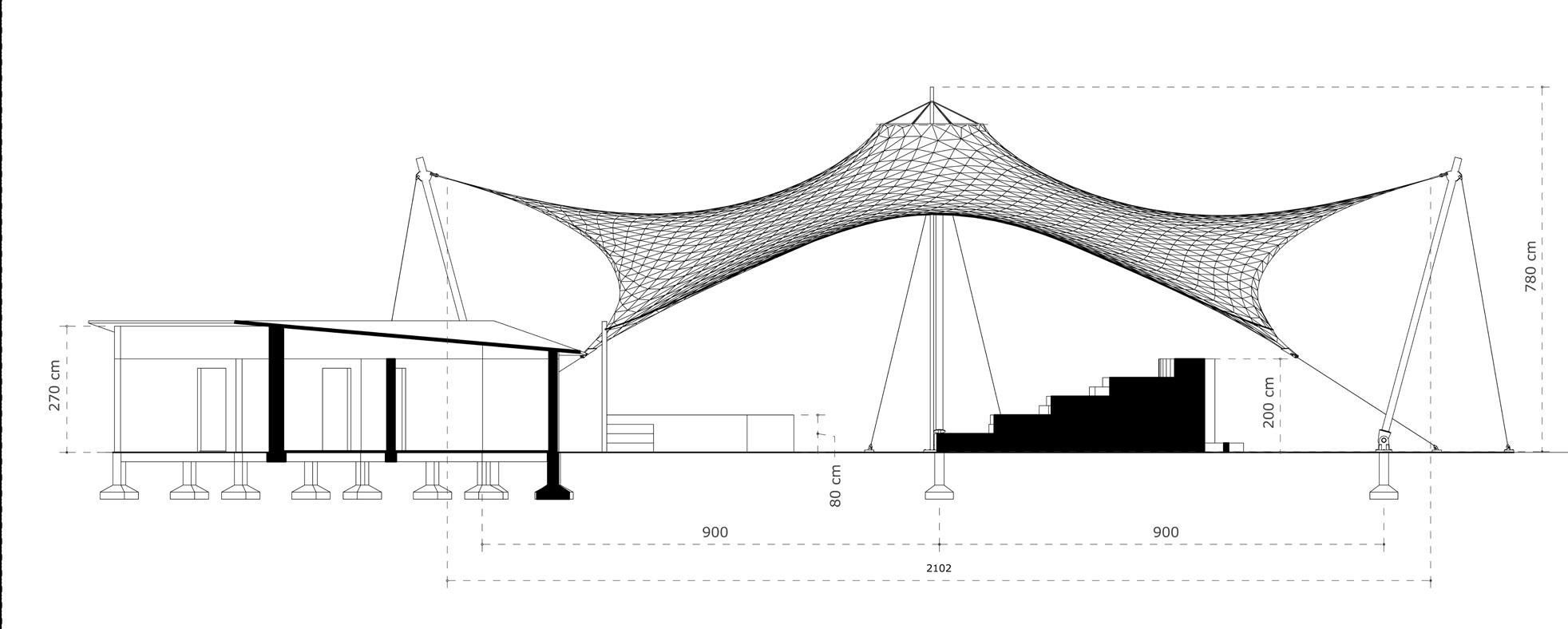 a recreation area in Central Jakarta, this amphitheater is used for performing arts activities, namely the Open Theater. The space can be used for various types of activities; art performances, dance, drama, music, exhibitions, exhibitions, receptions, hospitality, etc. Using a membrane structure, which is a thin flexible surface structure that carries loads connected by cables or ropes that generate tension.