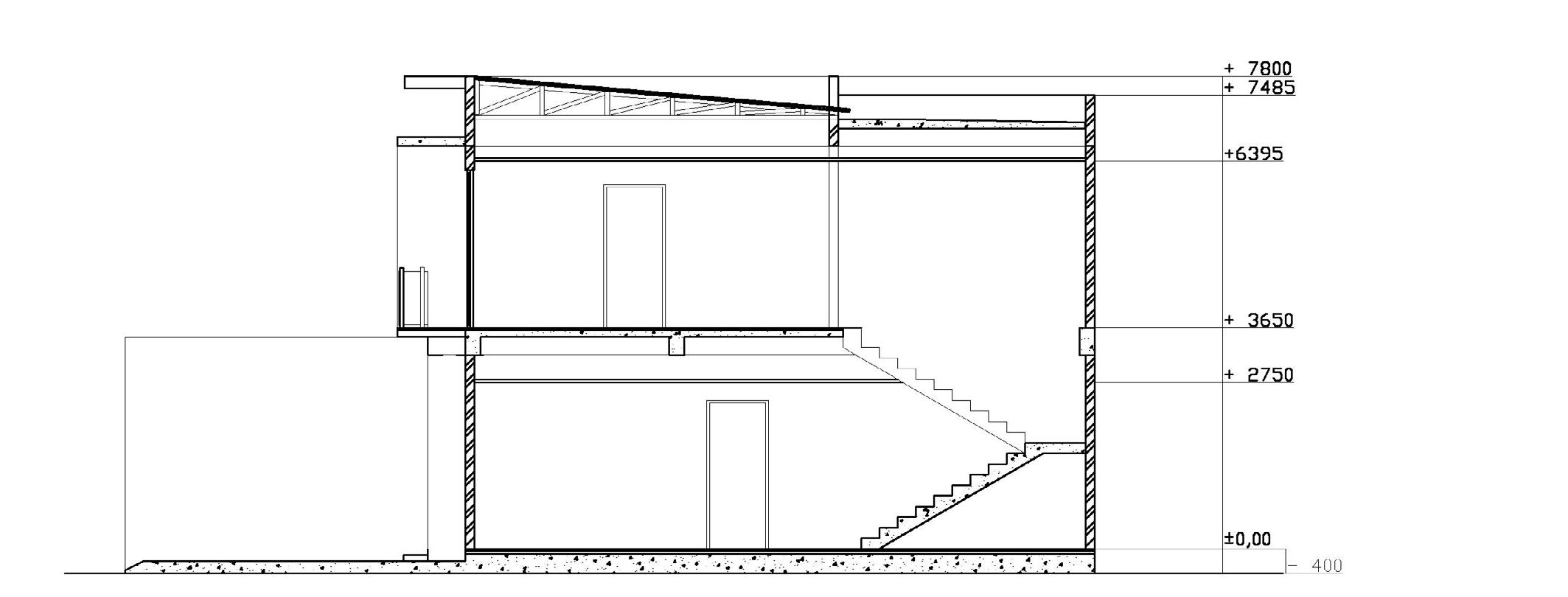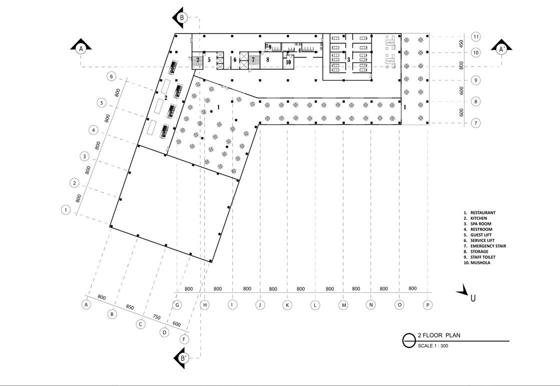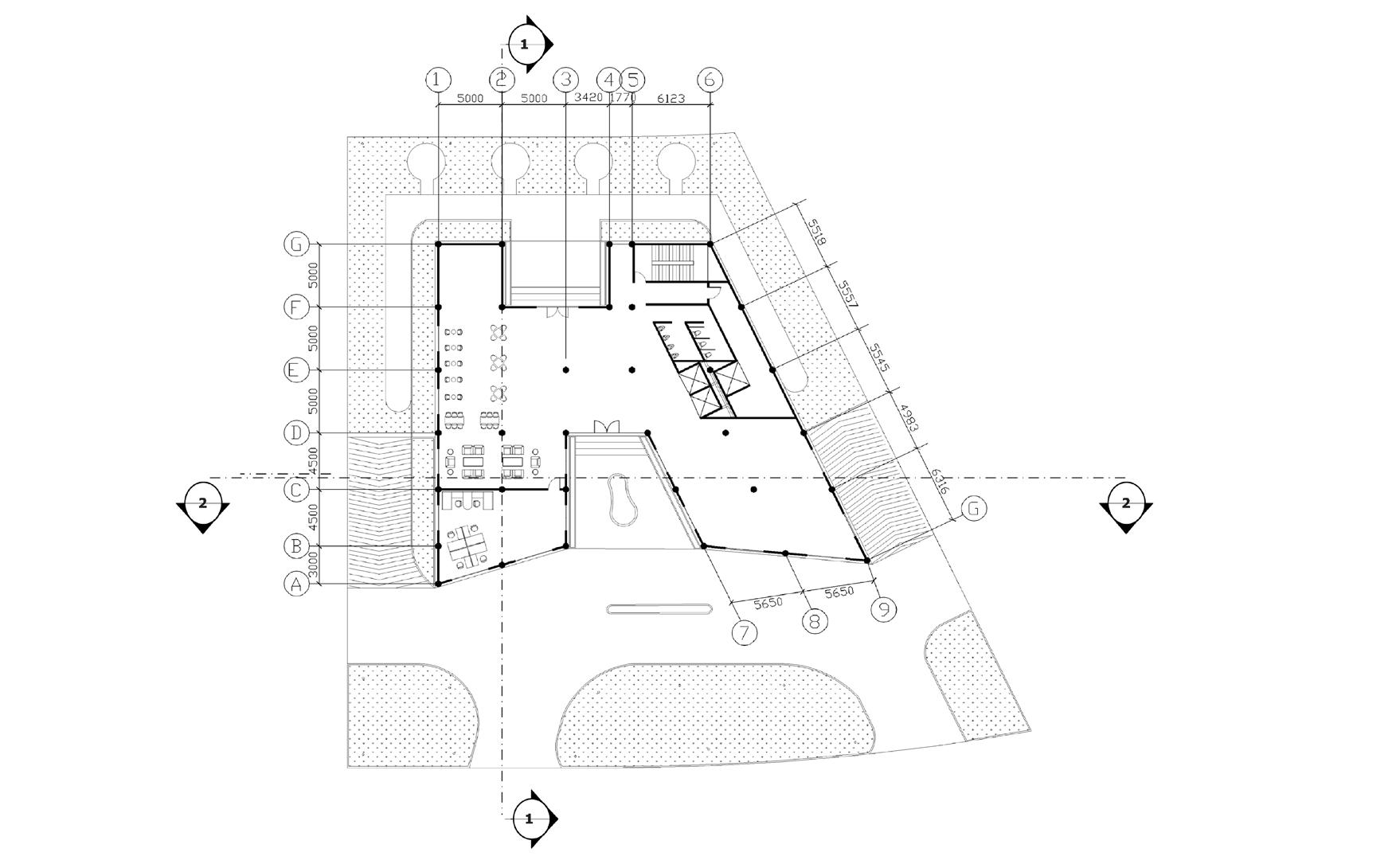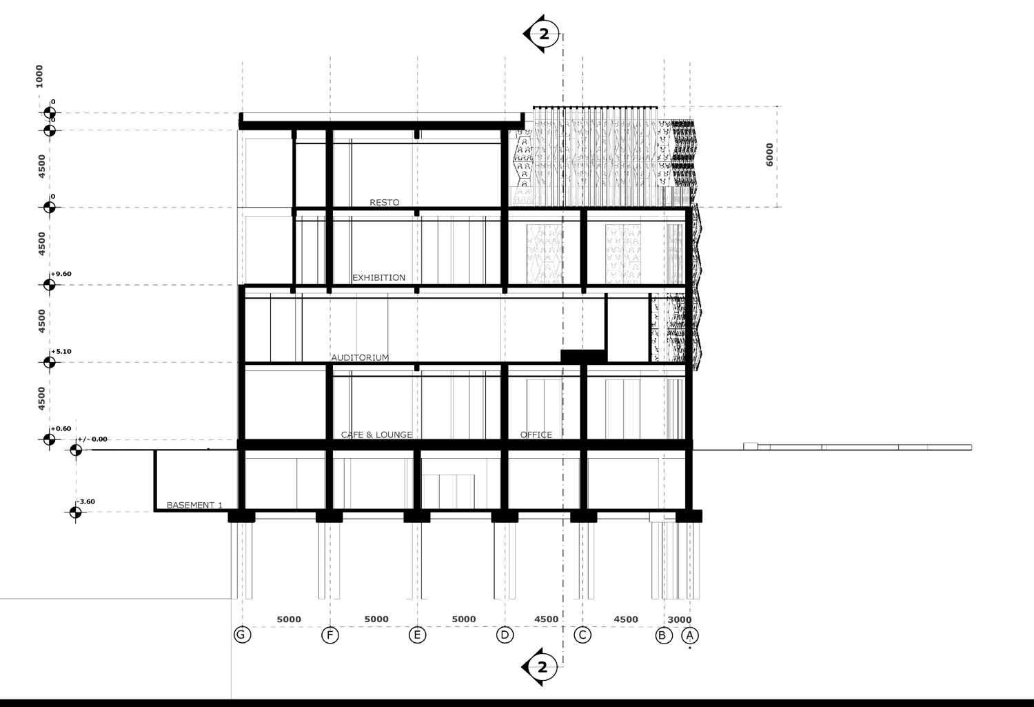 Tambi Gallery | 3rd Semester | 2022 OFFICE 1.OFFICE ROOM PUBLIC AREAS 2. CHANGING EXHIBITION 3. LOUNGE 4. CAFE 5. LOBBY 6. OUTDOOR FOYER 7. BACKYARD SERVICES 8. RESTROOM 9. PASSENGER LIFT 10. SERVICE LIFT 11. EMERGENCY STAIRS 12. STORAGE 1 2 3 4 5 6 8 9 10 11 12 KET: VEHICLE CIRCULATION Section 2-2 `Section 2-2 1 st Floor Plan 33