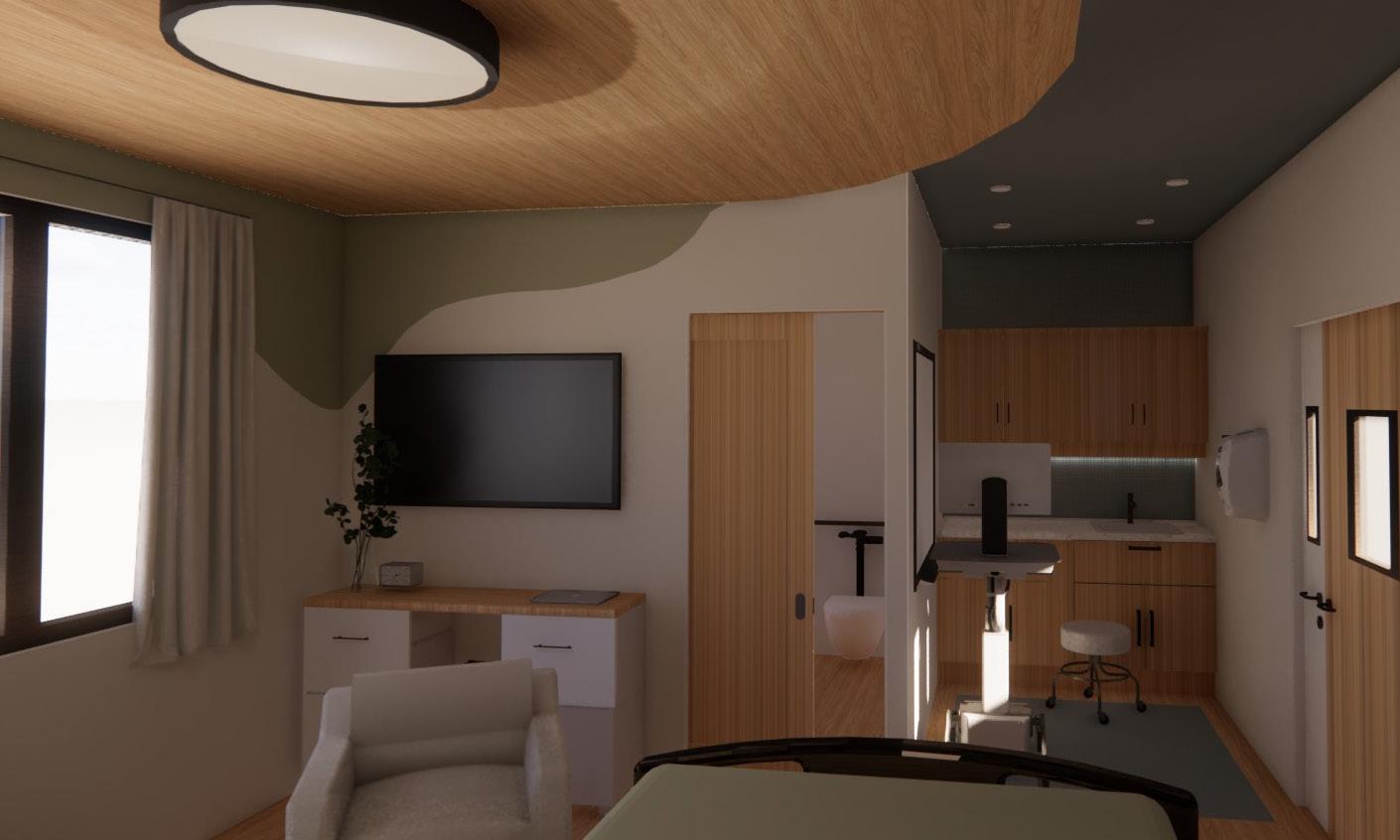 The design for the guest’s room aims to create a tranquil, comforting, and restful space that promotes natural healing through homelike design. Through utilizing natural tones, colors, and light, a visually appealing natural tones, colors, and light, a visually appealing space is created that easily facilitates connection between staff and visitors. In prioritizing simplicity of design and personal connection while integrating technology, staff can work efficiently and functionally while catering to guest and family needs.