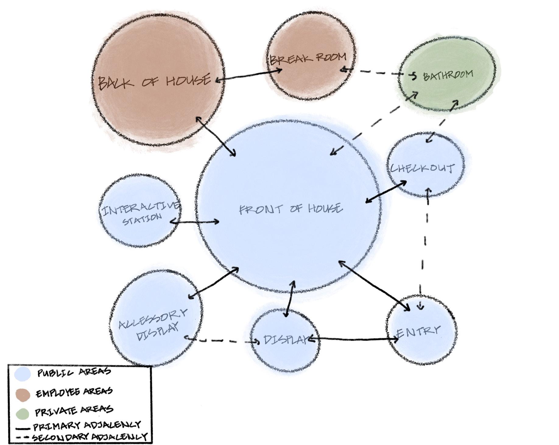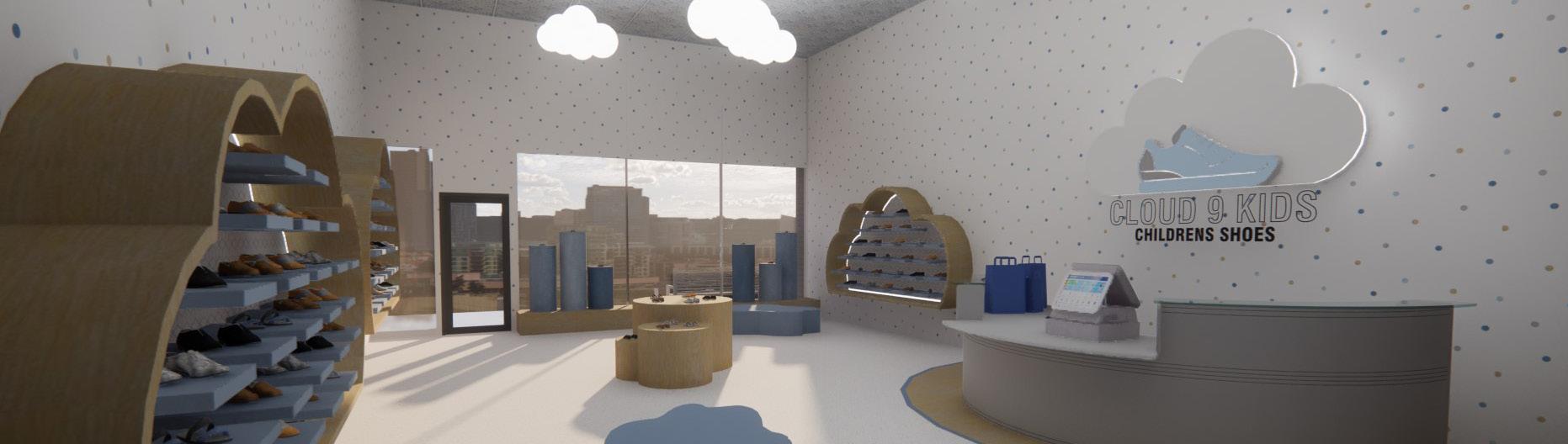 The design for Cloud Nine Kids aims to create a fun and interactive shoe shopping experience for children and parents alike. Through the use of pastel blues, smooth textures, and bright, natural lighting, the feeling of being surrounded by clouds is accomplished. Inclusion of interactive elements such as displays, furniture, and spaces for play capture the imagination of children and allow parents to relax as their children joyfully explore within the store. Overall this design creates a store full of function and whimsy for all ages through integration of universal design.