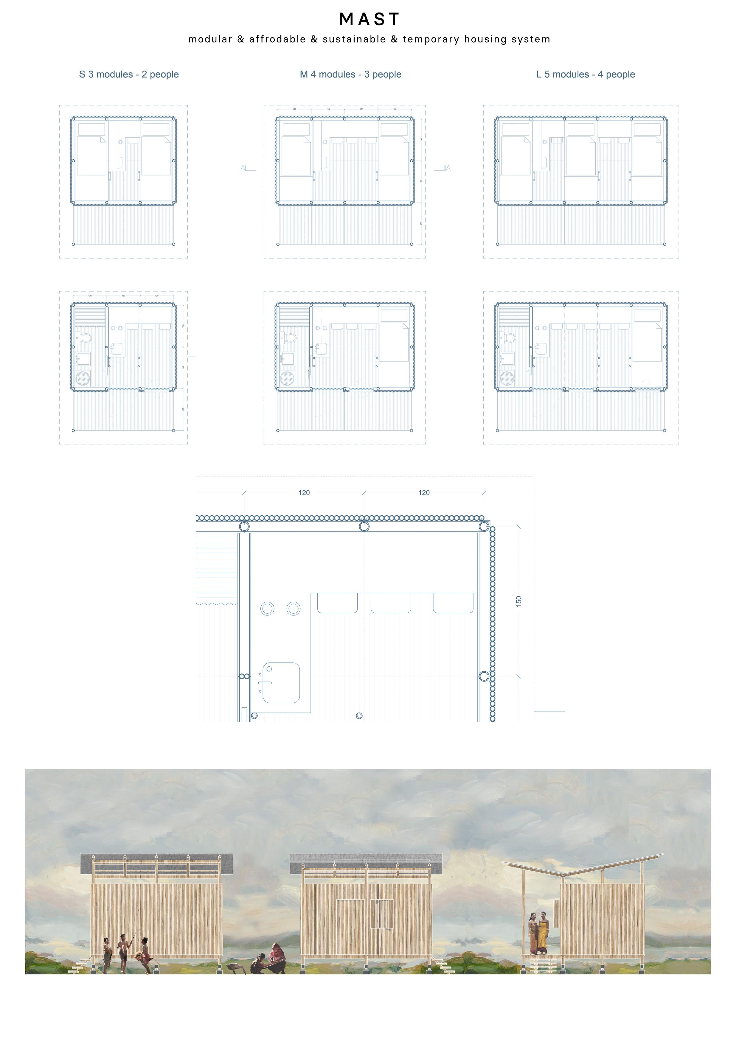 Houses can adapt to any area. The project concerns the island of Lombok, however, it can be implemented throughout Indonesia thanks to repetitive and easy to transport elements, eveything is based on a module 1,2 meters x 1,5 meters so people can mix the options to create a house that fulfill their needs the best. The aim of MAST is not only to serves its purpose as a shelter and support for the people in need but also, when multiplied, to give people a chance to create community by providing them their own private space, a home to live in and a neighborhood to meet with others.