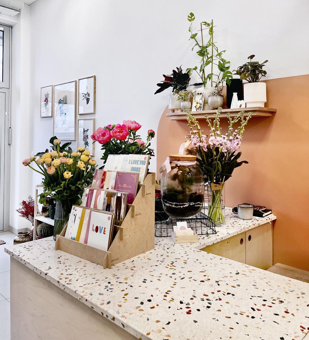 Chwasty i Kontrasty is a project created for amazing friends who decided to quit their corporate jobs and open their own flower shop to follow their dreams. The service venue is small in size, with a tiny back room and a rather small sales area. Due to the limited budget, shelving and other furniture was designed using simple and inexpensive building materials. Geometric shapes and colour on the walls were used to brighten up the interior. However, the colours of the flowers and the greenery of the plants are to play the main role. The counter was made of wooden plywood and terrazzo panels. In the back of the sales area, there is a bespoke folding table for art workshops for 6 people.