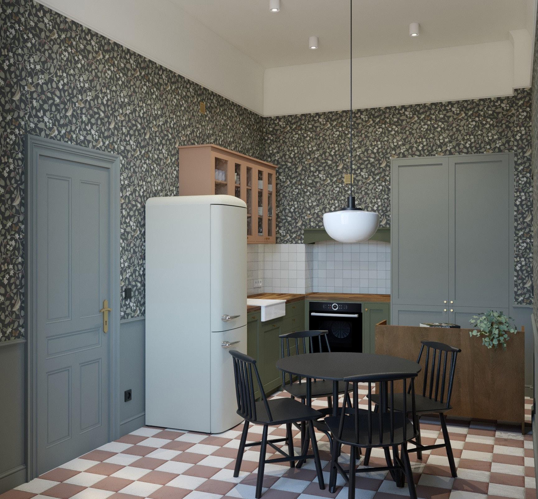 The flat design for a young student fascinated by the Milburn house from the TV series Sex Education. The series is about modern times, but the aesthetic of the set design may remind us of the 1980’s. The patterned, floral wallpaper by Morris & Co or Cole & Son’s helps to bring us back to a completely different world. This is what captivated our client and she really wanted her first independent flat to have a similar vibe. The apartment is located in an old townhouse in Wroclaw. We were able to keep the old door frame between the kitchen and the living room and it has now been given a new colour. Due to the height of the rooms, it was decided to use a loft space with a bed and a chest of drawers. The space underneath the mezzanine is used for storage and a work area.