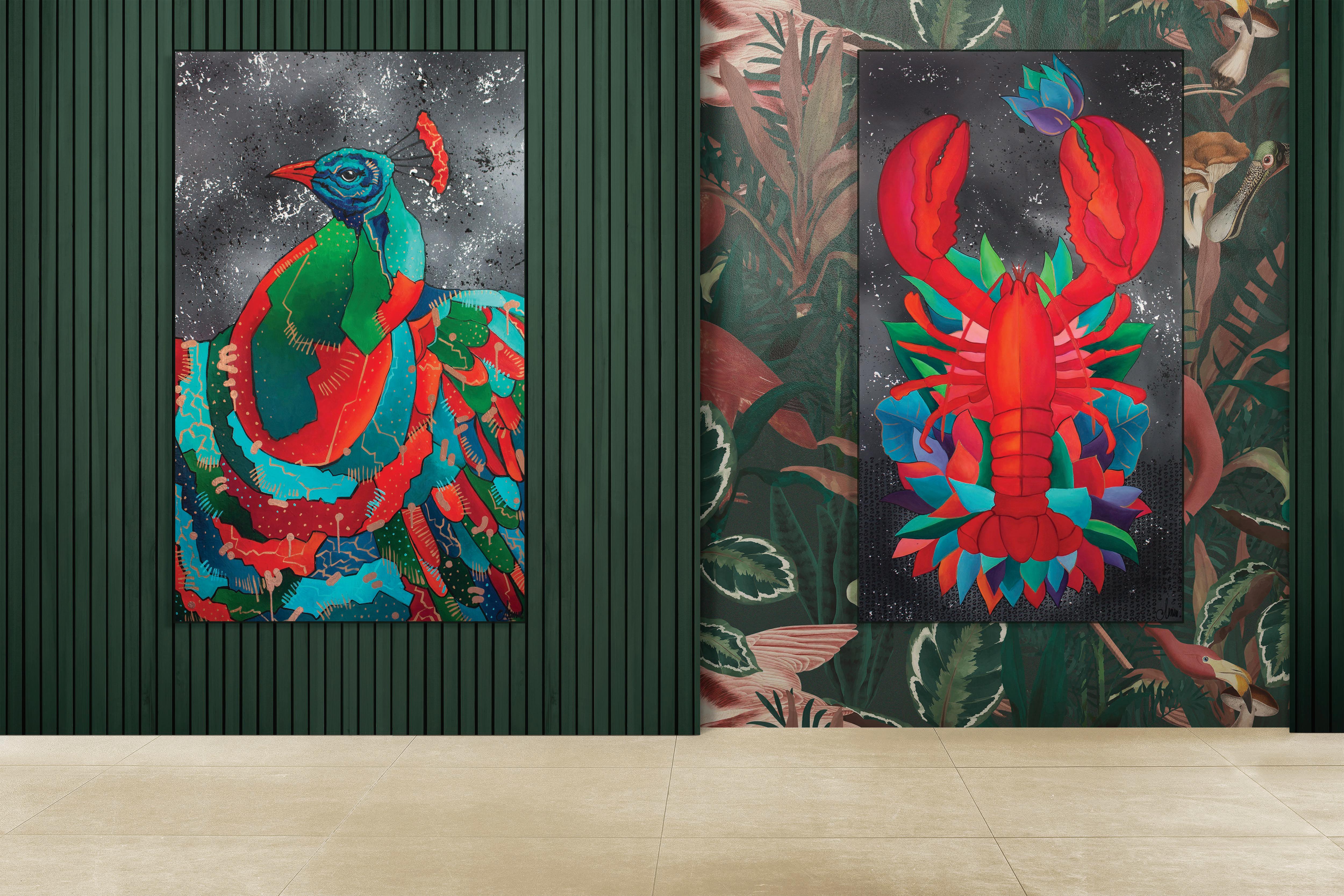The painting is energetic and colorful with metallic gold accents, illustrates a lobster going on a romantic date.