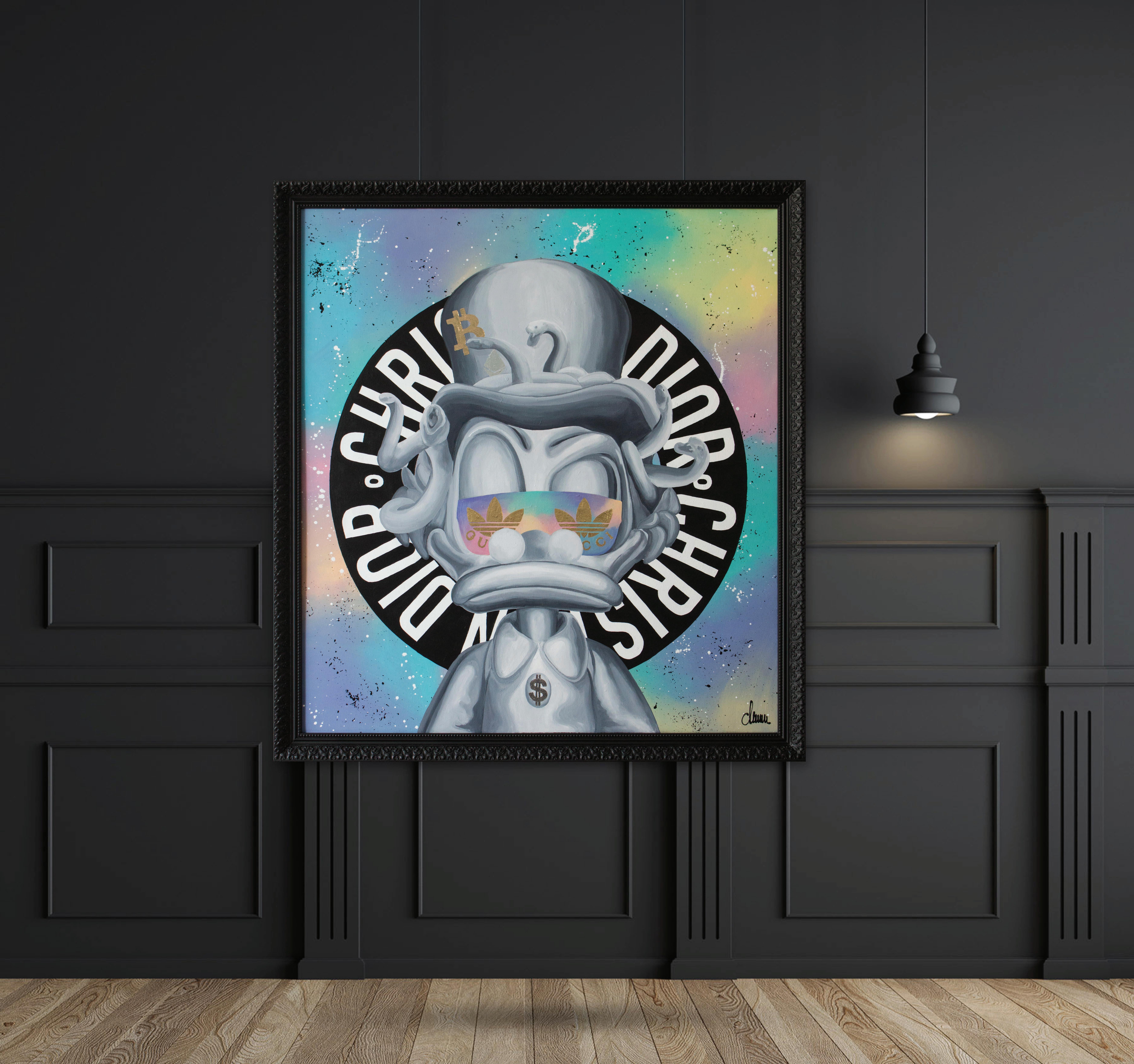 ‘CRYPTO BILLIONAIRE’ 2022. 121x111 cm in a black decorative frame. Acrylic and gilding on canvas.