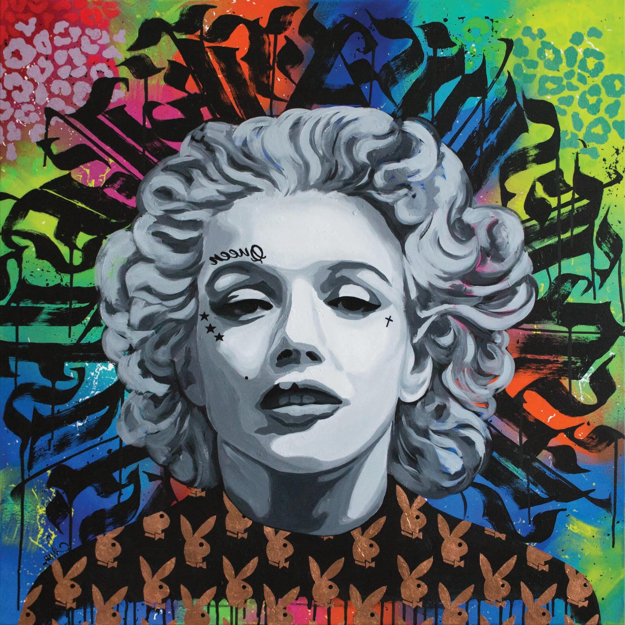 Portrait of the Marilyn queen with strong gothic black calligraphy in the background. Playboy bunnies made with gold-copper leaves, metallic animal patterns blending with the background on the top. An additional surprise is that some elements glow in fluorescent light. Intense colors and incredible energy.