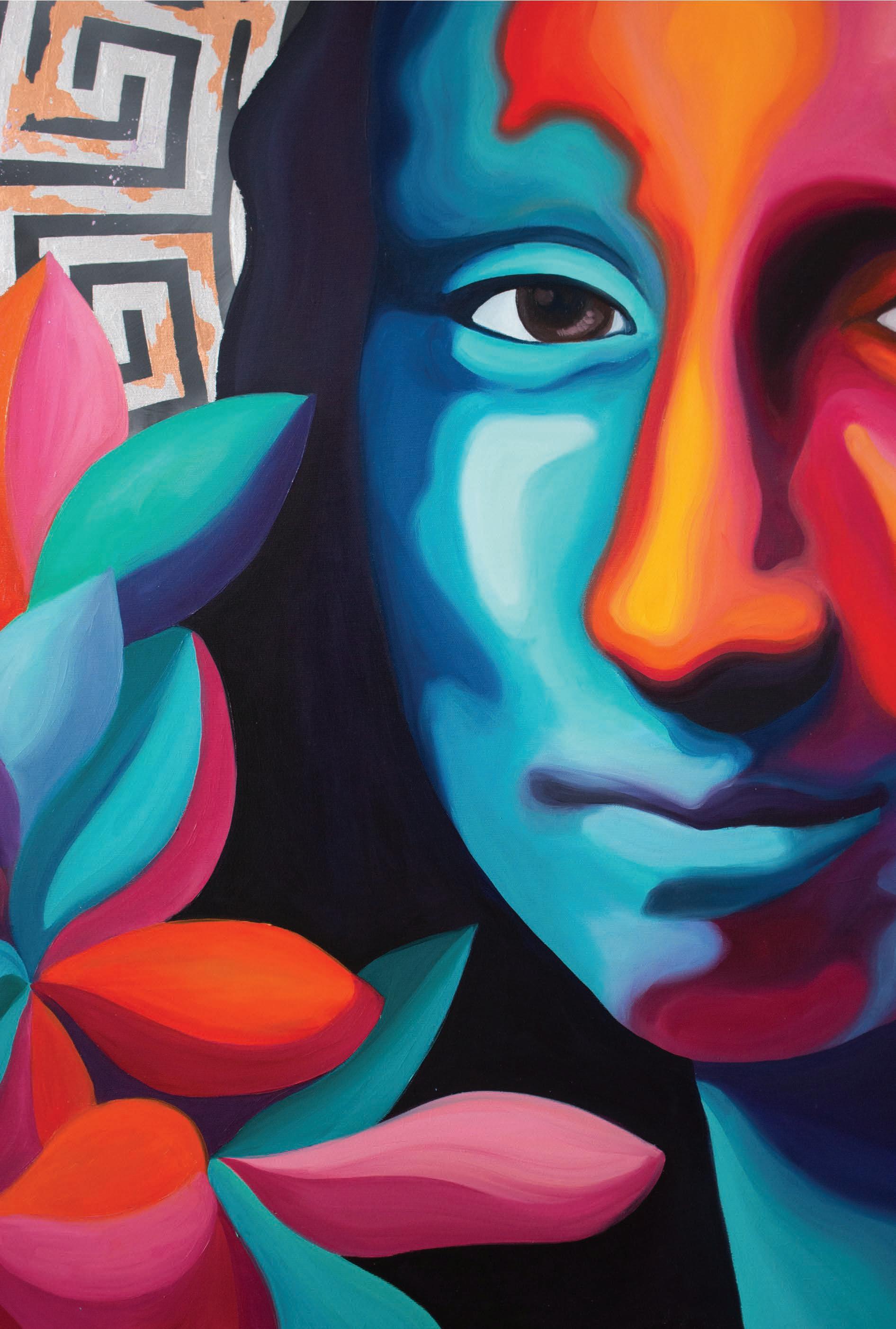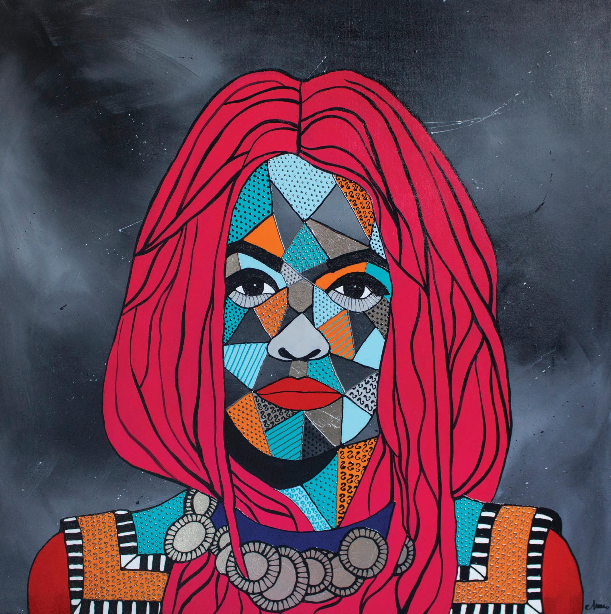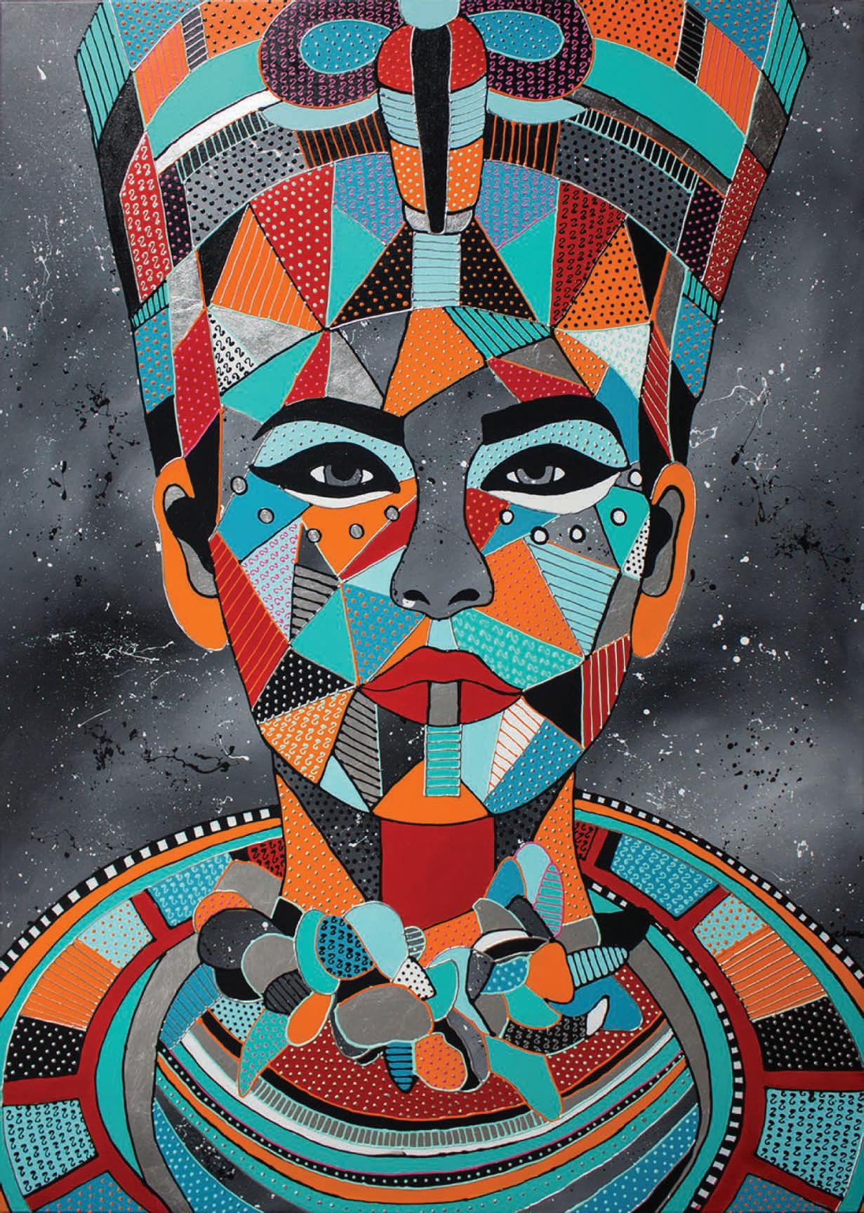 Portraits show the beauty of women, deep gaze and unique clothing. Geometric portraits are characterized by intense colors and an interesting texture of paints and acrylic pastes. Metallic elements of silver, gold, and copper introduce a lot of surprise, the reception of the illustrations becomes even more electric. Each of the presented characters has an intense look that is hard to resist.