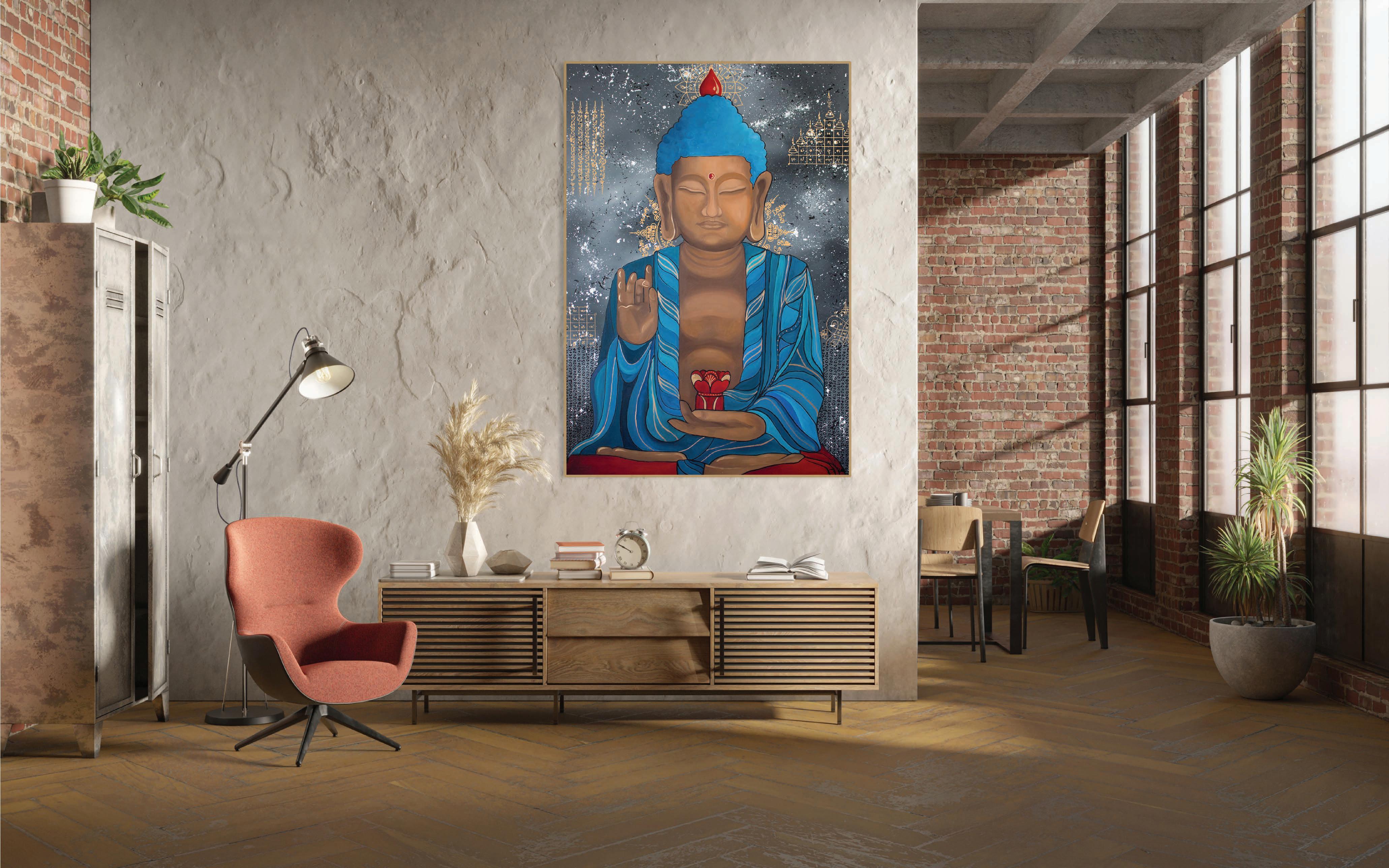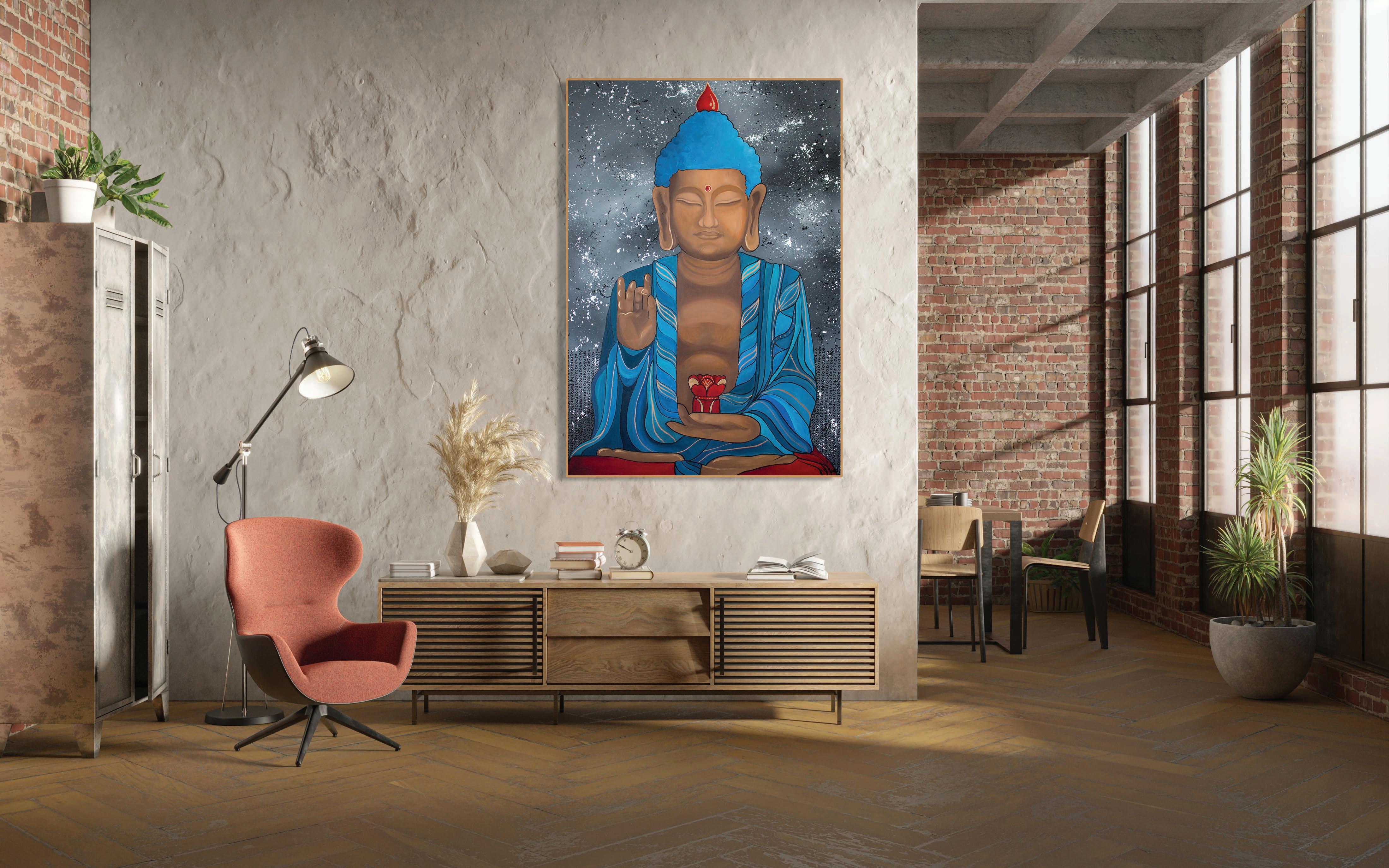 ‘BUDDHA MEDITATION IN A BLUE ROBE’ 2023. 130x90 cm. Acrylic paint on canvas.