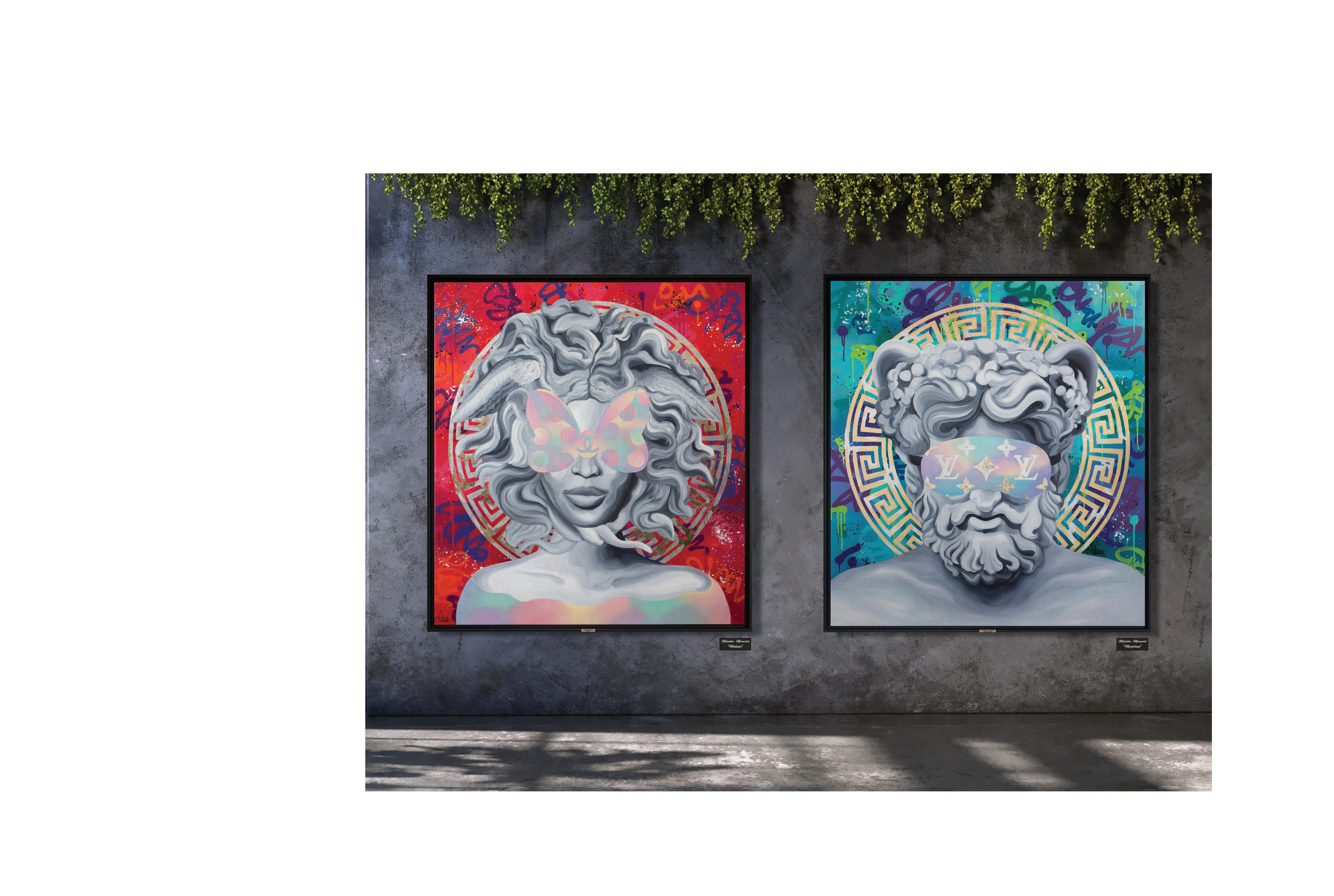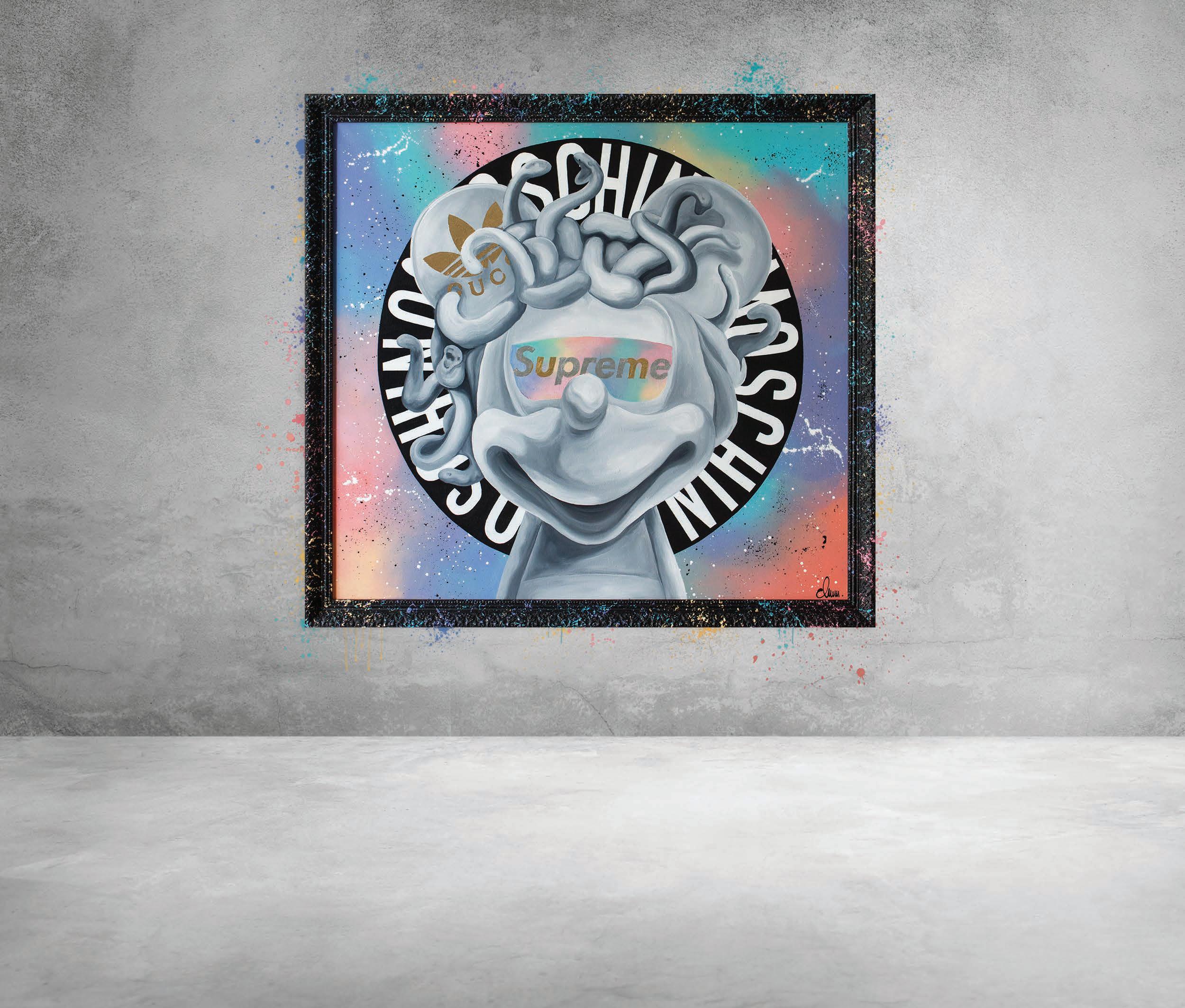 ‘MEDUSA IN FASHION CHANEL’ 2021. 115x105 cm in the American Box frame. Acrylic, oil, gra ti and gilding on canvas.