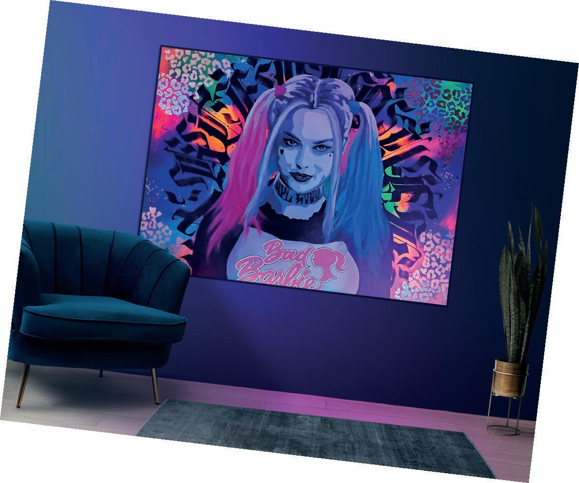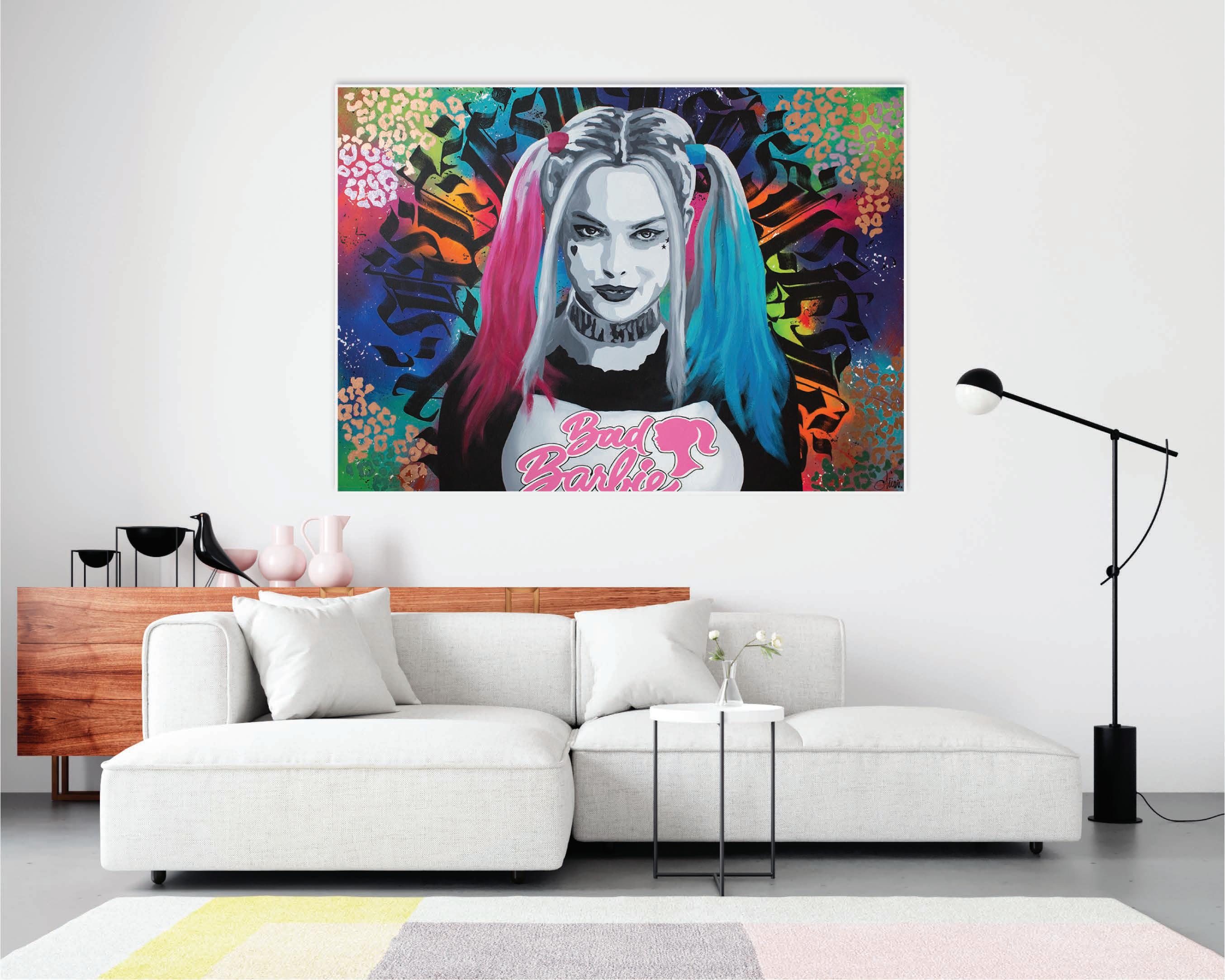 Harley Quinn as a Pop Art 'Bad Barbie' with tattoos and strong gothic calligraphy in the background. Animal motifs were created using metallic gold, pastel green, and pink sheets. Metallic patterns blend with the background. An additional surprise is that the painting shows a second face when illuminated with UV fluorescent light, it shows intense colors and incredible energy.