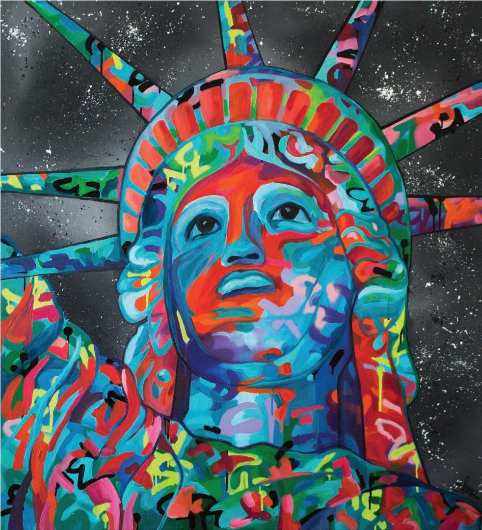 The Statue of Liberty was created from many layers of acrylic and spray paint with many splatters. It's inspired by Street Art. It's the expressive message about freedom.