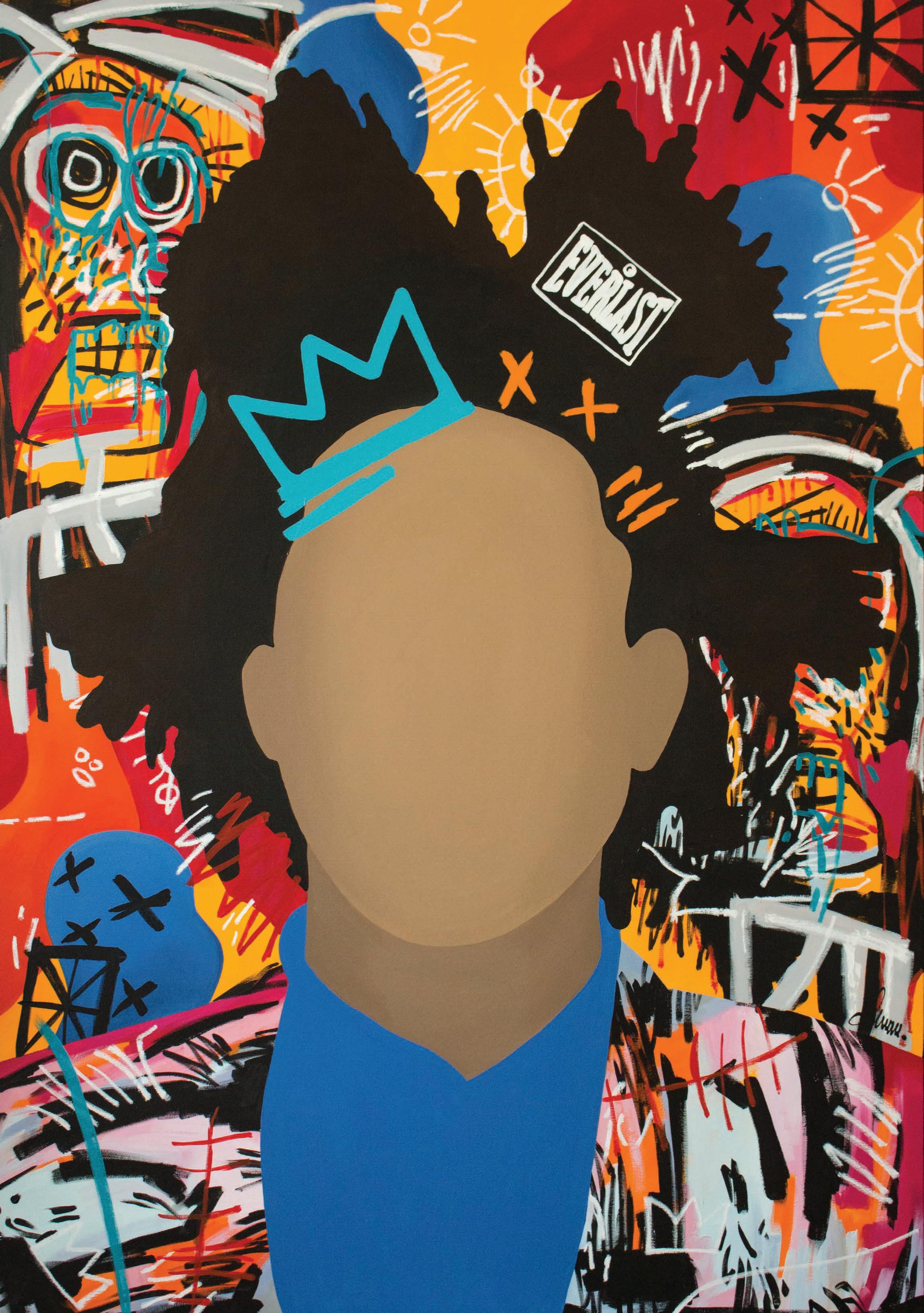 FACES AND SYMBOLS - BASQUIAT ’ 2021. 140x100 cm. Acrylic, oil markers on canvas.