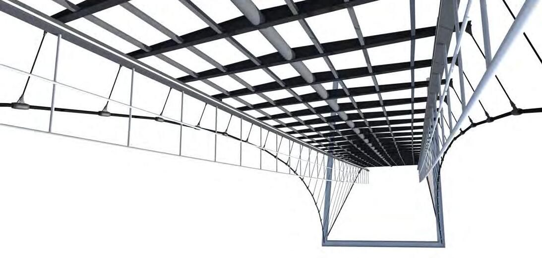 Jedná se o lehkou ocelovou zavěšenou konstrukci z profilů HEB a IPE. Pochozí vrstva je z hliníkových profilů s protiskluznou povrchovou úpravou. Jako povrchová úprava konstrkce je použito žárové zinkování. Materiálové i barevné ztvárnění je navrženo s ohledem na prostředí v blízkosti Všeobecné fakultní nemocnice Apolinář. Je použito přirozené zbarvení ocelové konstrukce.