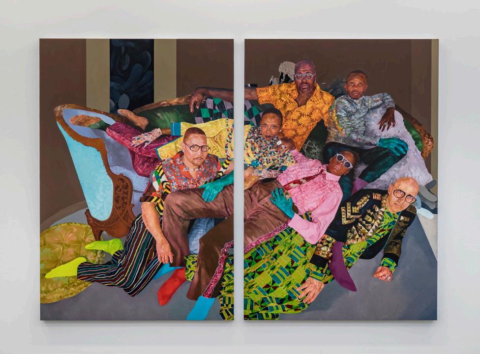 The sitter may have just rolled out of bed, onto a Persian rug strewn with pearls, but the floor’s intricate patterning mirrors an elaborate cascading event behind him. That cosmological Rorschach moment is coded with tree branches tied to the artist’s ancestral roots; futurist space helmets suggesting the gear of post-apocalyptic survivors; and the haunting owls of Francisco Goya’s Los Caprichos series, evoking a time of unrest. Are these his dreams, his subconscious? He’s a universe, a monument, unto himself.