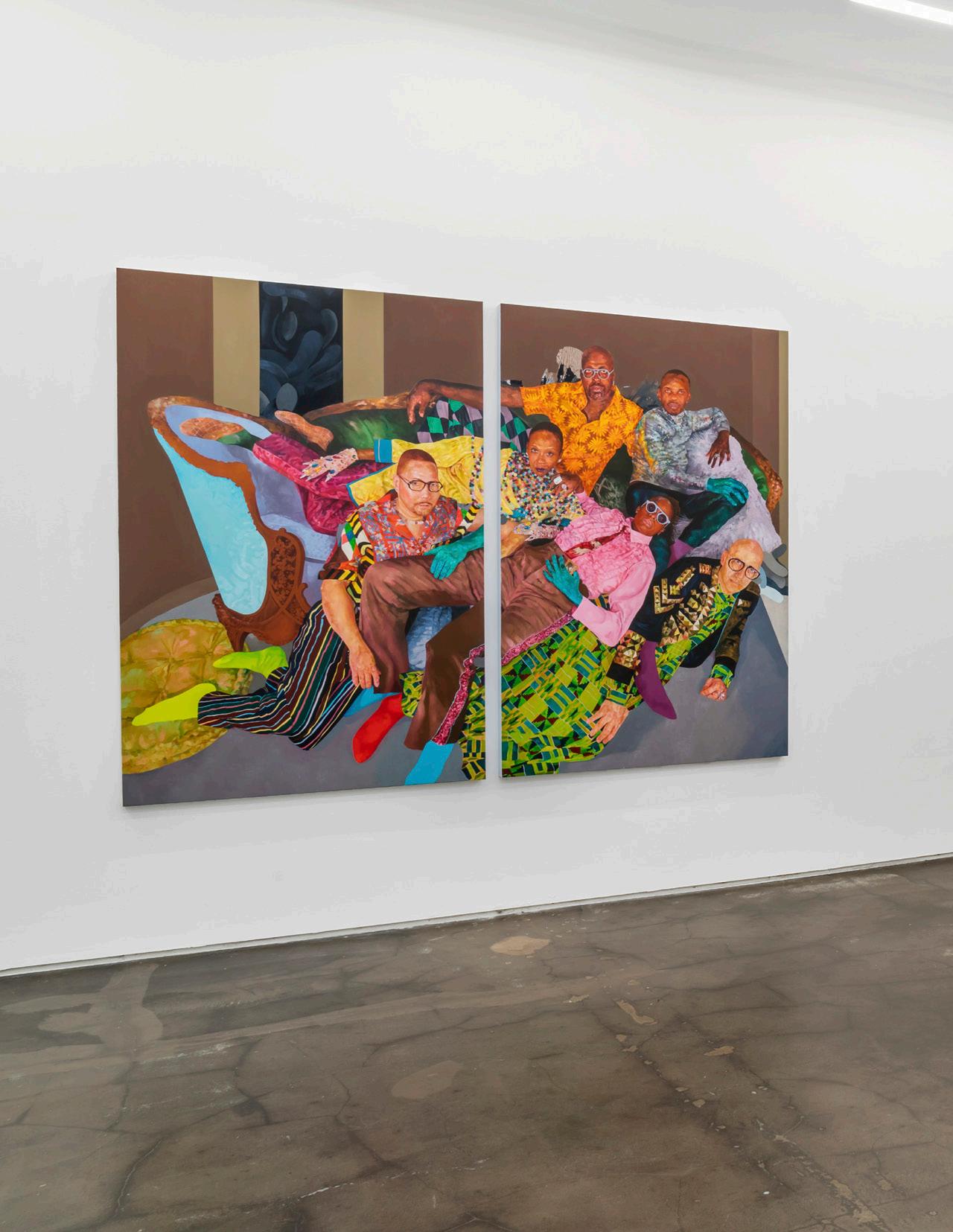 The colonial and Eurocentric roots of maritime painting evolved alongside European colonization of the Americas, Africa, and various other regions worldwide, made possible through seafaring. A particular work resonated with the artist during his travels, Raft of the Medusa by Théodore Géricault. Monumental in stature and considered to be the most famous painting of a shipwreck, it narrates the tale of the French frigate Medusa’s shipwreck and the plight of the survivors adrift on a makeshift wooden raft. America’s deep relationship with its waterways involve complex histories, with the sea representing a feeling of connection, vast expansiveness, beauty, and violence. For Black and Latinx Americans, the history of home making is inextricably linked with conflict. In the painting titled, iknowyou’vebeenwonderingwherei’vebeen:adrift,adraft,astare,atill,asigh,exhale.but,icamebacktoletyouknow,gotathingforyou,andican’letitgo_theraft., Cruz’s subjects billow atop fragmented furniture within a liminal space, their forms enacting a similar composition to Medusa, à la lost at sea. But rather than a hopeless depiction, the figures are resolute in their commitment to and safe keeping of each other. iknowyou’vebeenwondering… is a celebration of how our bodies represent home, and there is room for everyone on this raft.