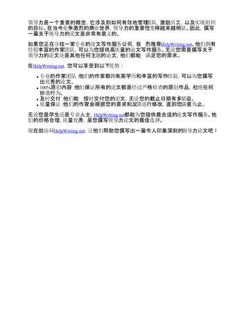 领导力是一个重要的概念,它涉及到如何有效地管理团队,激励员工,以及实现组织 的目标。在当今竞争激烈的商业世界,领导力的重要性变得越来越明显。因此,撰写 一篇关于领导力的论文是非常有意义的。