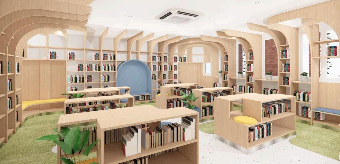 For this additional library, it has a mezzanine space so that it can see the mountains in Bogor. This library takes the concept of nature and "fun" so that the selection of materials such as younger wood, the presence of green carpets that mimic grass, and also some placement of fake plants in the short bookcase. This library is filled with seating areas for freetime lessons together and individual areas on the mezzanine floor.
