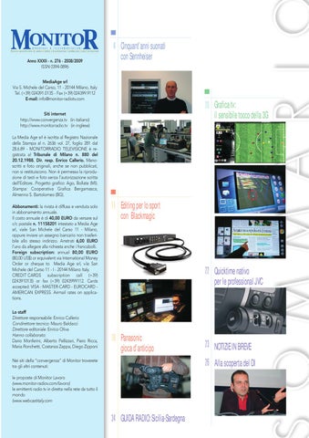 Siti internet http://www.convergenza.tv (in italiano) http://www.monitorradio.tv (in inglese) La Media Age srl è iscritta al Registro Nazionale della Stampa al n. 2636 vol. 27, foglio 281 dal 28.6.89 - MONITORRADIO TELEVISIONE è registrata al Tribunale di Milano n. 880 del 20.12.1988. Dir. resp. Enrico Callerio. Manoscritti e foto originali, anche se non pubblicati, non si restituiscono. Non è permessa la riproduzione di testi e foto senza l’autorizzazione scritta dell’Editore. Progetto grafico: Ago, Bollate (MI). Stampa: Cooperativa Grafica Bergamasca, Almenno S. Bartolomeo (BG). Abbonamenti: la rivista è diffusa e venduta solo in abbonamento annuale. Il costo annuale è di 40,00 EURO da versare sul c/c postale n. 11158201 intestato a Media Age srl, viale San Michele del Carso 11 - Milano, oppure inviare un assegno bancario non trasferibile allo stesso indirizzo. Arretrati 6,00 EURO l’uno da allegare alla richiesta anche i francobolli. Foreign subscription: annual 80,00 EURO (80,00 US$) or equivalent via International Money Order or cheque to Media Age srl, v.le San Michele del Carso 11 - I - 20144 Milano Italy. CREDIT CARDS subscription call (+39) 0243910135 or fax (+39) 0243999112. Cards accepted: VISA - MASTER-CARD - EUROCARD AMERICAN EXPRESS. Airmail rates on applications. Lo staff Direttore responsabile: Enrico Callerio Condirettore tecnico: Mauro Baldacci Direttore editoriale: Enrico Oliva Hanno collaborato: Dario Monferini, Alberto Pellizzari, Piero Ricca, Maria Ronchetti, Costanza Zappa, Diego Zipponi