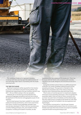 THE TIME FOR CHANGE Significant investment will be required from the industry to convert current fleets to forward moving vehicles, and VicRoads has implemented a five year transition period (1 July 2017 – 30 June 2022) to phase in the new spreaders. VicRoads plan on introducing synchronised bitumen spraying and aggregate spreading machines that combine the application of the bitumen and aggregates as part of one operation. Synchronised sprayers have been available for many years mainly from Europe and America, and in more recent times from China. Forward moving aggregate spreaders have recently been developed in France, with two manufacturers currently trialling prototype units, and a handful of other companies, including some based in Australia, are also www.infrastructuremagazine.com.au