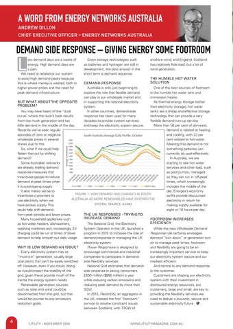 One of the best sources of footroom is the humble hot water tank and immersion heater. BUT WHAT ABOUT THE OPPOSITE As thermal energy storage (rather PROBLEM? than electricity storage), hot water You may have heard of the “duck tanks are a cheap and effective storage curve”, where the duck’s back results technology that can provide a very from too much generation and too flexible demand turn-up service. little demand in the middle of the day. More than 50 per cent of domestic Recently we’ve seen regular demand is related to heating episodes of zero or negative and cooling, with 23 per wholesale prices in several cent related to hot water. states due to this. Meeting this demand is not So, what if we could help something batteries can flatten that out by shifting currently do cost-effectively. demand? In Australia, we are Some Australian networks starting to see hot water are already trialling demand services and other load, such response measures that as pool pumps, managed incentivise people to reduce so they can run in ‘off-peak’ demand at peak times when times, which increasingly it is outstripping supply. includes the middle of the It also makes sense to day. Energex’s economy FIGURE 1: HOW DEMAND HAS CHANGED IN SOUTH incentivise customers to tariffs provide discounted AUSTRALIA AS MORE RENEWABLES HAVE ENTERED THE use electricity when we electricity in return for SYSTEM. SOURCE: AEMO have excess supply. This making supply available for could help shift demand eight or 18 hours per day. from peak periods and lower prices. THE UK RESPONSES –TRYING TO INCREASE DEMAND Many household appliances such FOOTROOM INCREASES EFFICIENCY as hot water heaters, dishwashers, The National Grid, the Electricity washing machines and, increasingly, EV System Operator in the UK, launched a While the new Wholesale Demand charging could be run at times of lower program in 2015 to increase the role of Response rule certainly envisages demand to help smooth out daily usage. demand response in managing the UK demand “turn down” or generation turn electricity system. on to manage peak times, footroom WHY IS LOW DEMAND AN ISSUE? Power Responsive is designed to and flexibility are going to be an Every electricity system has its encourage commercial and industrial increasingly important service to keep “must-run” generation, usually large companies to participate in demandour electricity system secure and our coal plants that can’t be easily switched side flexibility services. markets efficient. off. However, even if you could, doing National Grid estimates that demandAnd central to any demand response so would impact the stability of the side response is saving consumers is the customer. grid, given these provide much of the £500 million ($885 million) a year Customers are shaping our electricity inertia the energy system needs. while reducing carbon emissions and system with their investment in Renewable generation sources reducing peak demand by more than distributed energy resources, but such as solar and wind could be 3GW. customers, large and small, are key to disconnected from the grid, but that In 2015, Flexitricity, an aggregator in providing the flexibility services we would be counter to any emissions the UK, created the first “footroom” need to deliver a low-cost, secure and reduction goals. service to resolve constraint issues sustainable electricity future. between Scotland, with 7.3GW of