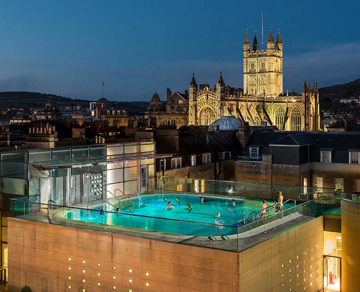 A modern spa where you can soak in Bath’s famous natural thermal waters and enjoy a rooftop pool with views over Bath.