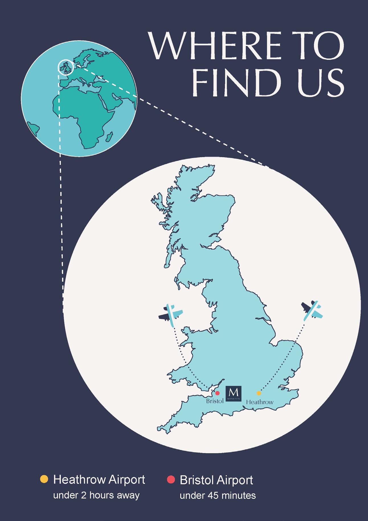 Bristol Airport is within easy reach of Monkton (20 miles). Other regional airports include Birmingham (80 miles), Heathrow (100 miles), Stansted (120 miles) and Gatwick (125 miles). All have regular International flights.