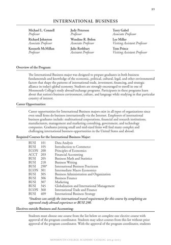 Overview of the Program: The International Business major was designed to prepare graduates in both business fundamentals and knowledge of the economic, political, cultural, legal, and other environmental factors that shape the patterns of international trade, investment, financing, and strategic alliance in today’s global economy. Students are strongly encouraged to enroll in one of Monmouth College’s study abroad/exchange programs. Participants in these programs learn about that nation’s business environment, culture, and language while studying in that particular country of interest. Career Opportunities: Career opportunities for International Business majors exist in all types of organizations since even small firms do business internationally via the Internet. Employers of international business graduates include: multinational corporations, financial and research institutions, manufacturers, management and marketing consulting, government, and technology companies. Graduates joining small and mid-sized firms will find many complex and challenging international business opportunities in the United States and abroad. Required Courses for the International Business Major: BUSI 101 Data Analysis BUSI 105 Introduction to Commerce ECON 200 Principles of Economics ACCT 203 Financial Accounting BUSI 205 Business Math and Statistics BUSI 218 Business Writing BUSI 290* International Business Practicum ECON 301 Intermediate Macro Economics BUSI 305 Business Administration and Organization BUSI 306 Business Finance BUSI 307 Marketing BUSI 345 Globalization and International Management ECON 360 International Trade and Finance BUSI 409 International Business Strategy *Students can satisfy the international travel requirement for this course by completing an approved study abroad experience or BUSI 290. Electives outside Business and Accounting: Students must choose one course from the list below or complete one elective course with approval of the program coordinator. Students may select courses from this list without prior approval of the program coordinator. With the approval of the program coordinator, students