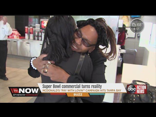 Starting February 2nd, the chain let random customers pay for their food with different forms of what McDonald’ s calls “lovin’,” which could include selfies and hugs. ” Customers who order items during preselected times will get to participate in the deal. McDonald’s employees will let customers know if they get to “Pay with Lovin’.” The Super Bowl ad showcased how the scheme will work in restaurants.