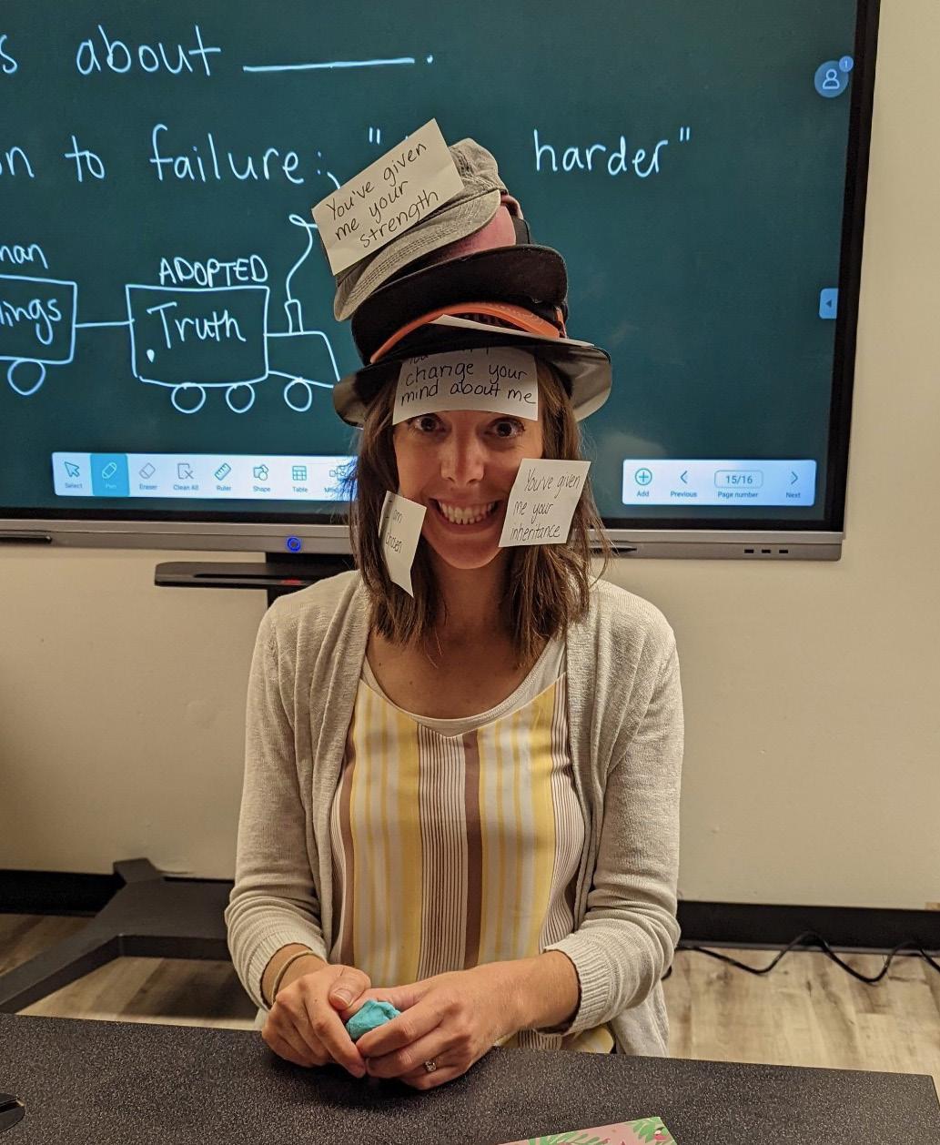 Next, I entered God into the scene. I had each student bring me a hat to place on my head. Each hat had one of these truths taped to it.