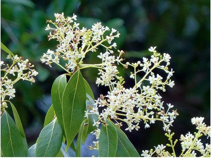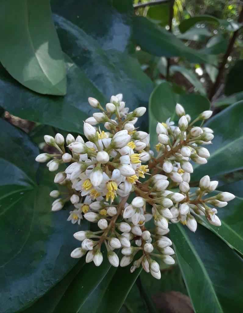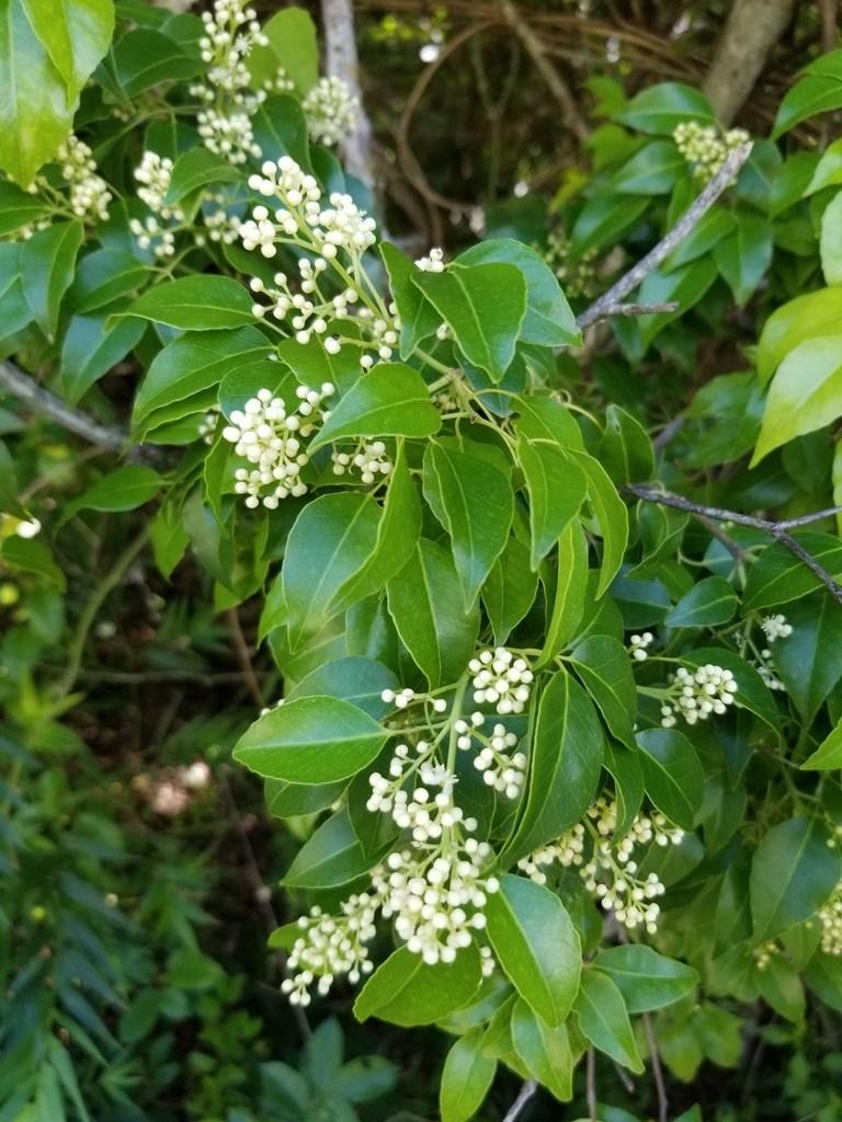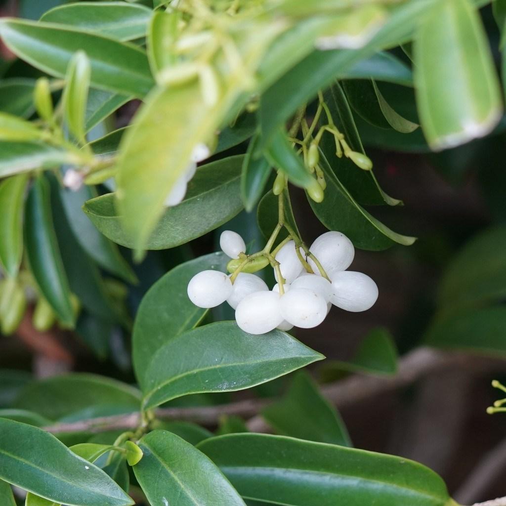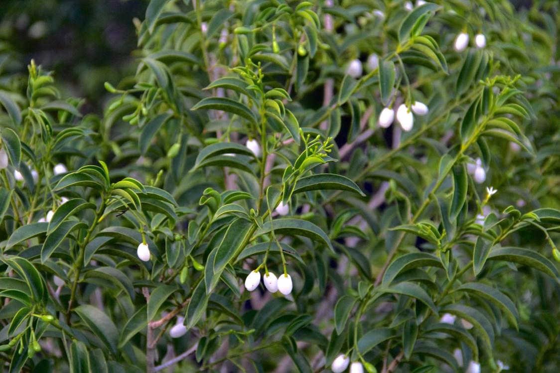 C. alba is the most common species. It boasts clusters of small, fragrant, white to yellow flowers that bloom year-round, followed by round, snow-white berries, adding ornamental charm to landscapes. This shrub typically reaches a height of 6 to 12 feet, featuring glossy green leaves arranged neatly along its branches. This species prefers part shade.