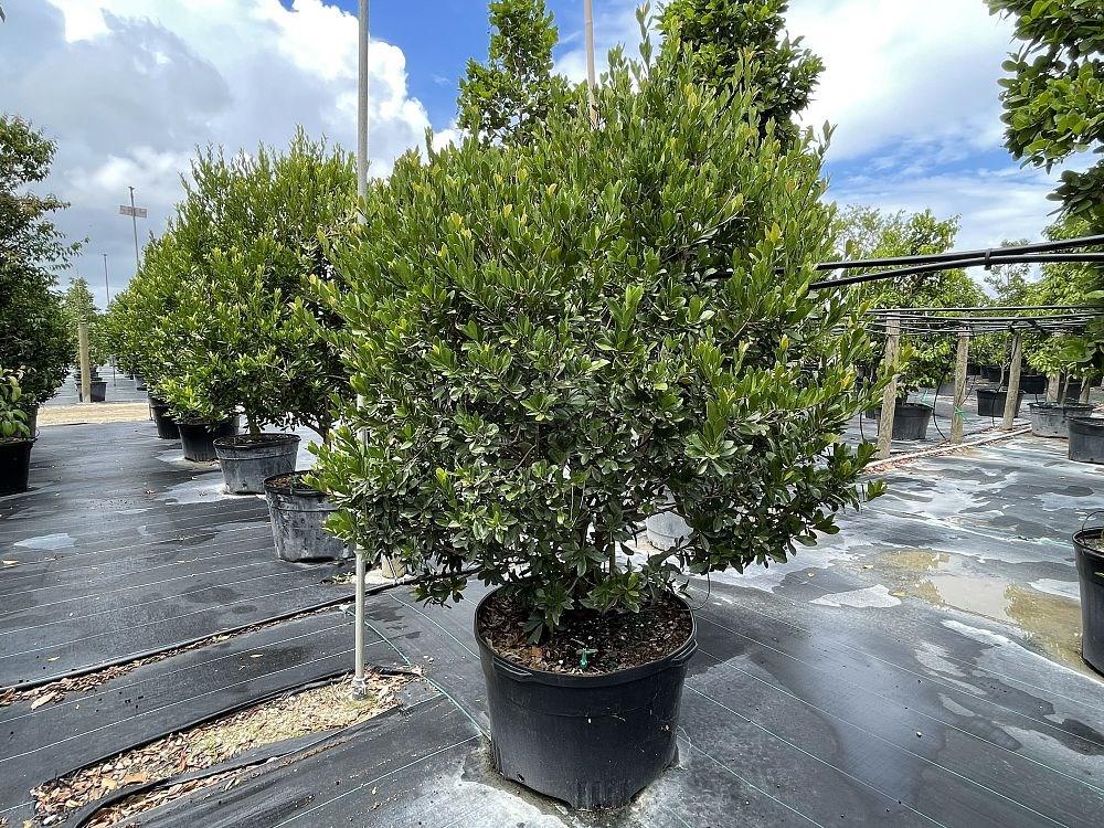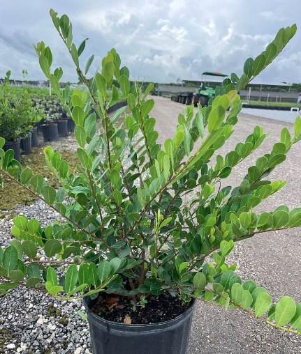 This species, widely employed in Keys landscapes, showcases two color variations: green and silver, both of which serve admirably as hedges or trees. The green morph grows up to 30 feet tall when cultivated as a tree, while the silver morph tends to be smaller and more shrub-like. When grown as a tree, the green variety often exhibits expansive, sprawling trunks that radiate widely from the center. Thriving best in full sun, this plant serves as a nectar source for the amethyst hairstreak and various other butterflies.
