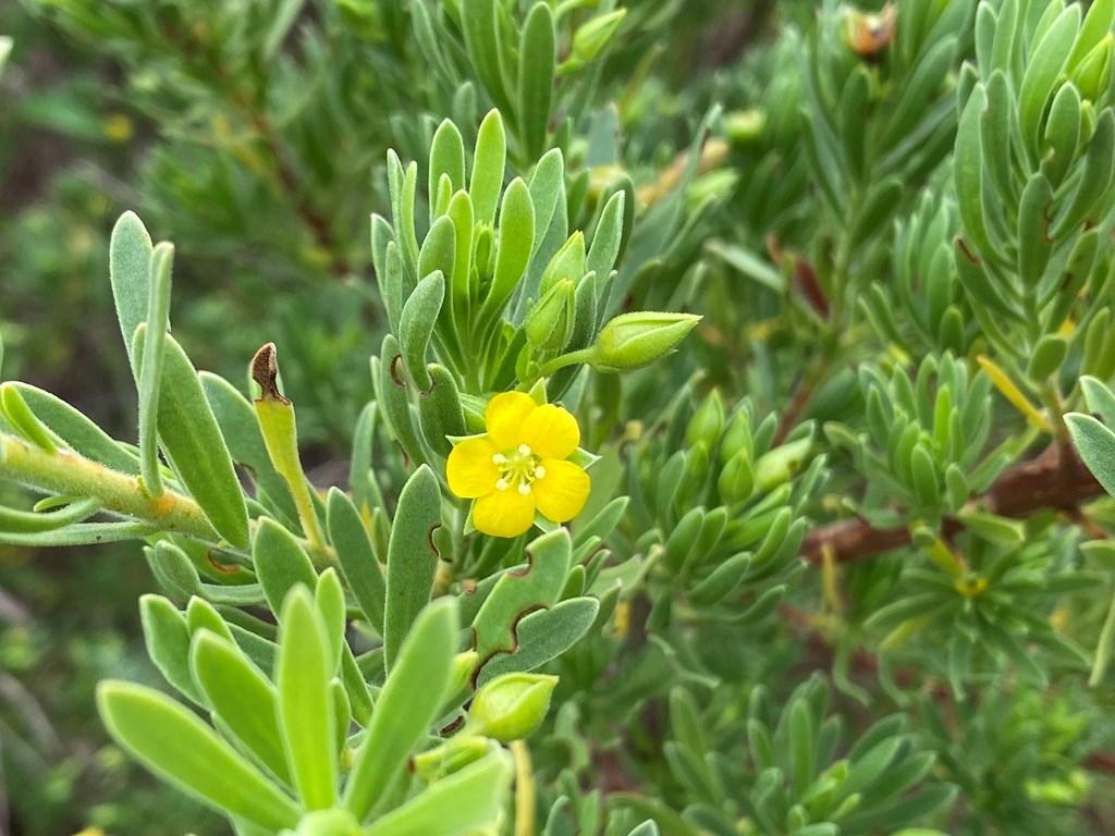 Abundant small, shiny green leaves, sometimes tinged with a faint yellow hue, adorn its sprawling limbs, which reroot easily, facilitating its spread. Delicate pinkish white tubular flowers give way to round yellow fruits. Thriving in full sun and capable of withstanding moist soils, it stands as an excellent choice for plantings in swales.