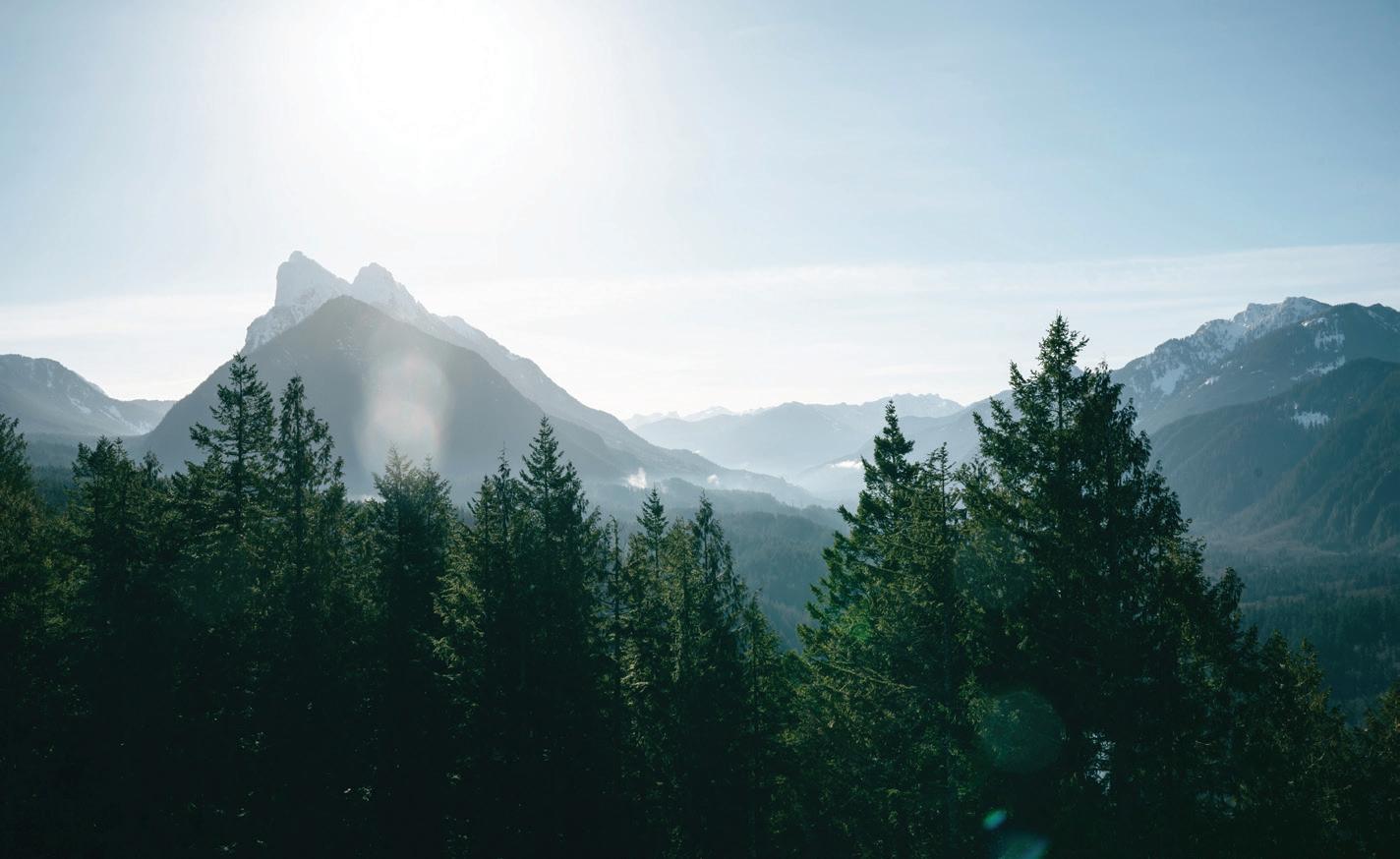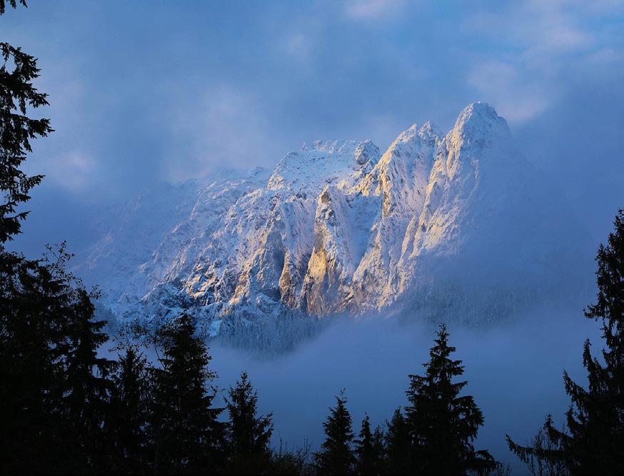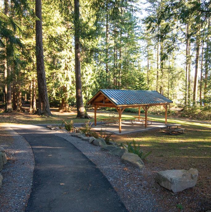 It starts to gain elevation almost right away, promising excellent views as it pitches steeply upward through this richly fragrant secondgrowth forest. This region of the Mt. Baker-Snoqualmie National Forest showcases a diverse population of trees, including alder, big leaf maple, western red cedar, western hemlock and Douglas fir. If the air seems fresher and more oxygeninfused, that’s because it is. Sword ferns drape gracefully from mosscovered boulders and huckleberry bushes rise from the long-ago shorn cedar stumps that they’ve claimed as their homes.