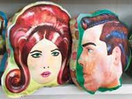 American parrots in trees. Frances’ work gravitates toward 1960s-era imagery, even incorporating the bouffant do’s that adorn her custom pillows featured in Seattle Magazine into chandelier forms that straddle the line of art and utility — “our next big innovation,” he says — “fun and crazy” she says. The artists like to showcase the complimentary work of other artists, including drawer pulls from a local blacksmith. Frances displays some of her custom made dresses and tops, crafted from a customer’s favorite t-shirt collection. Every one is bright, energetic and eclectic like herself.